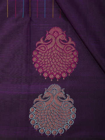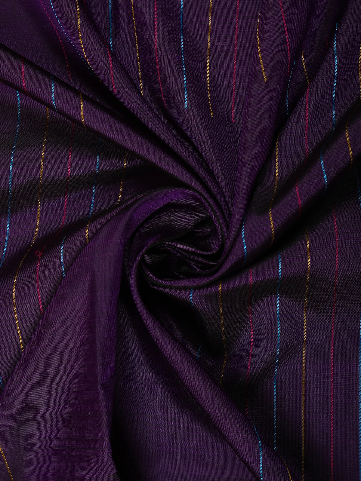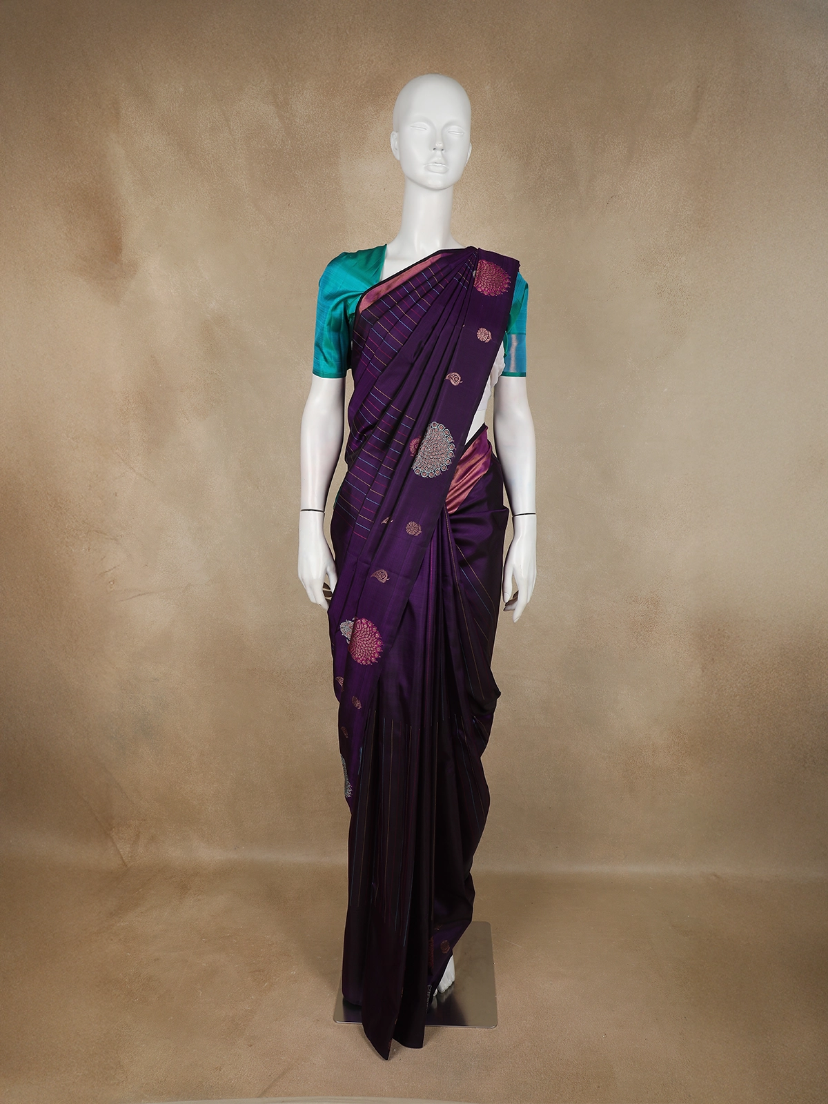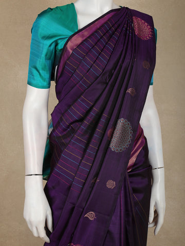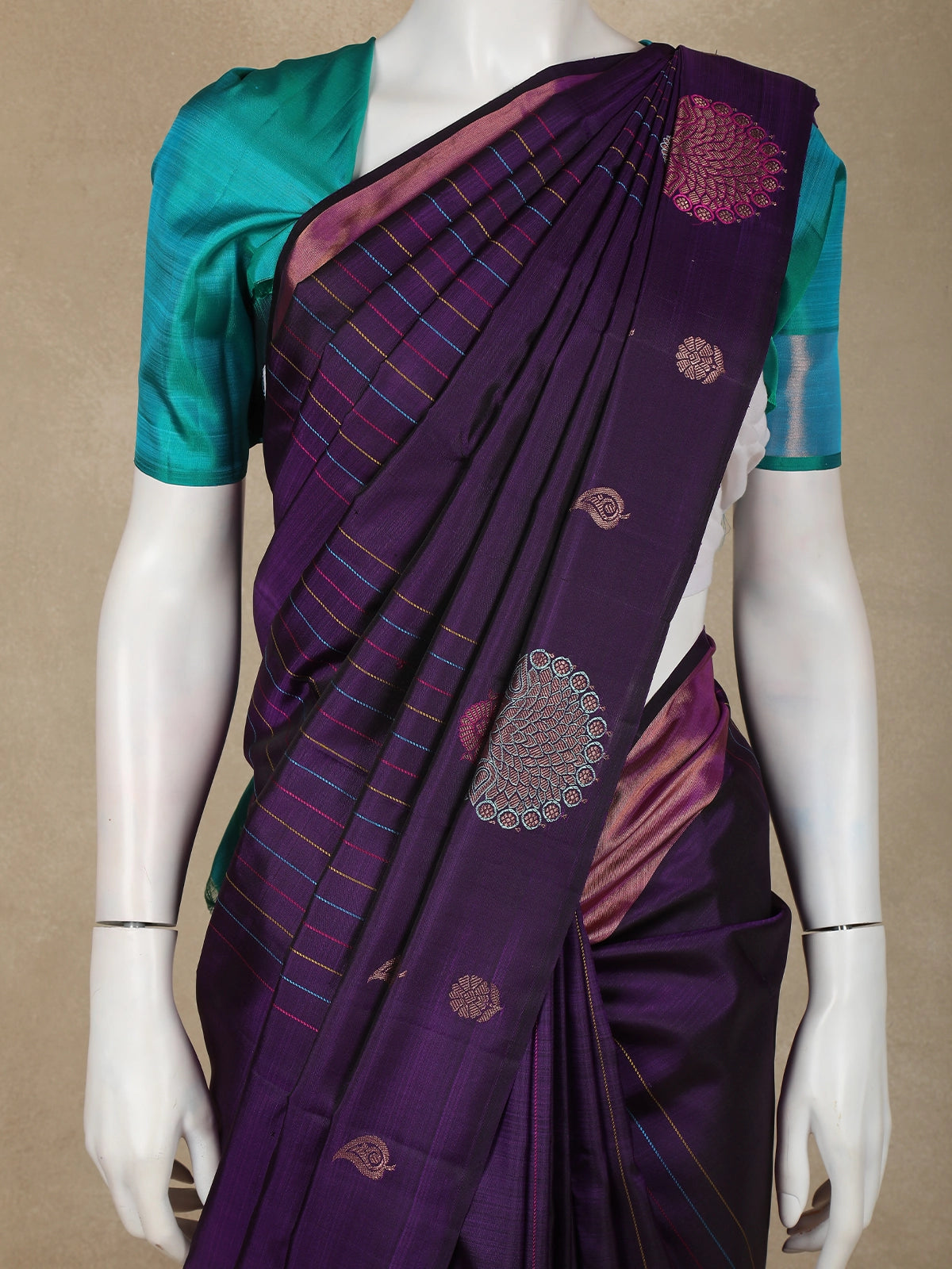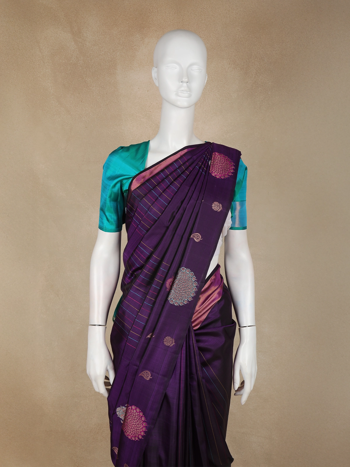 Royal Purple Peacock Striped Woven Design Pure Kanchipuram Silk Saree with Contrast Blouse