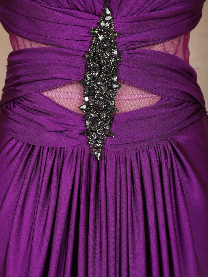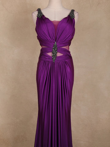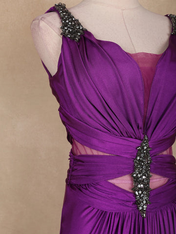 Royal Purple Stone Embellished Cut-Out Draped Satin Gown