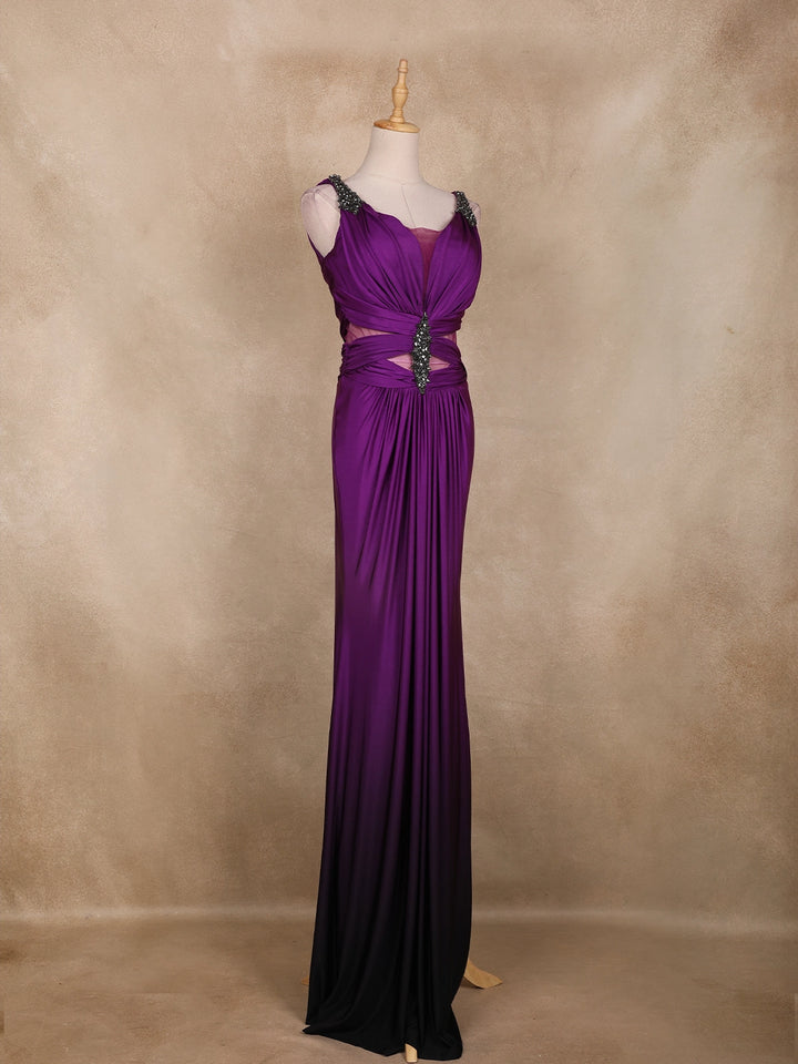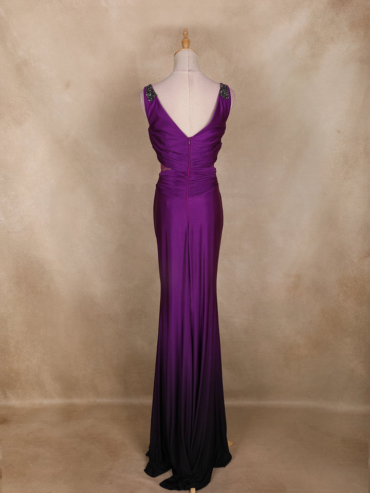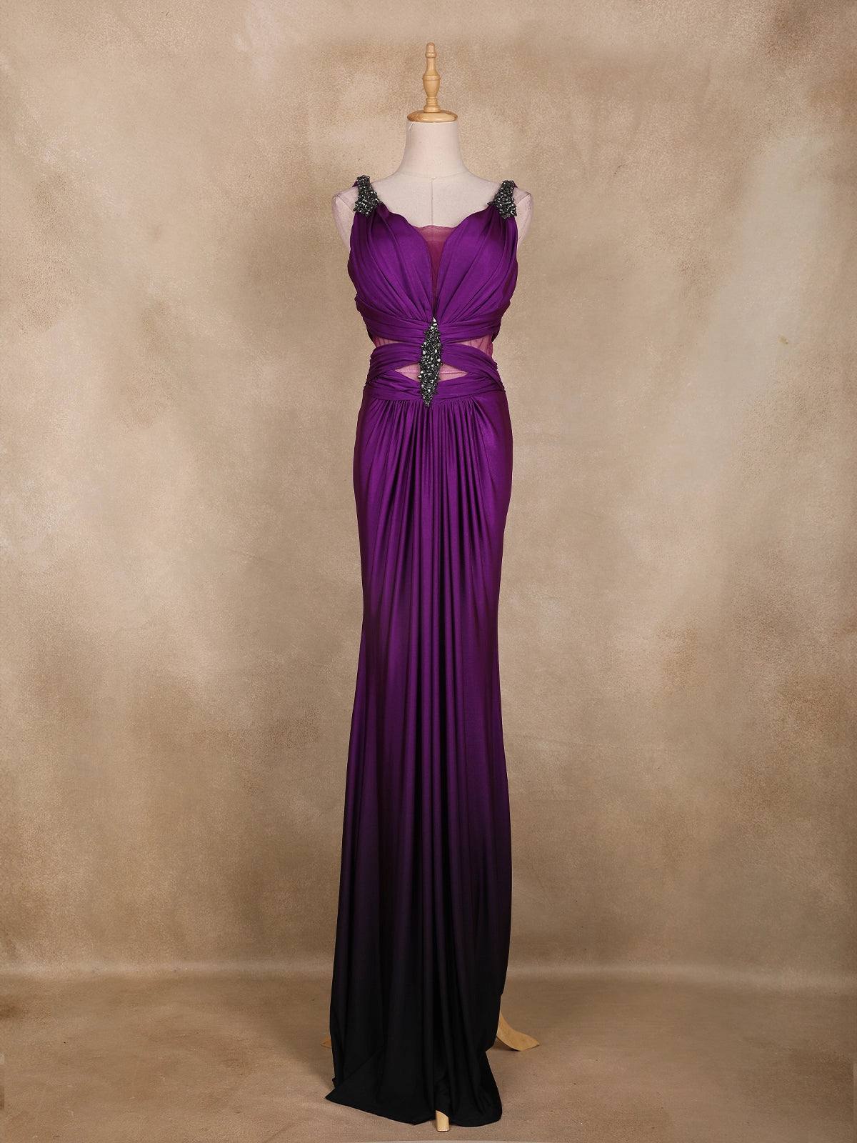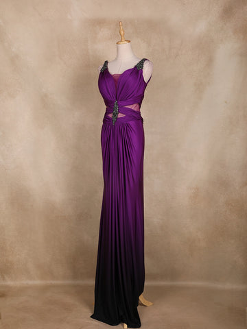 The gown features a strategically draped bodice and waist cut-out, cinched with ornate black and silver bead embellishments that draw attention to your silhouette. The ombre fade from purple to black at the hem gives a rich gradient effect, making this piece both modern and regal.