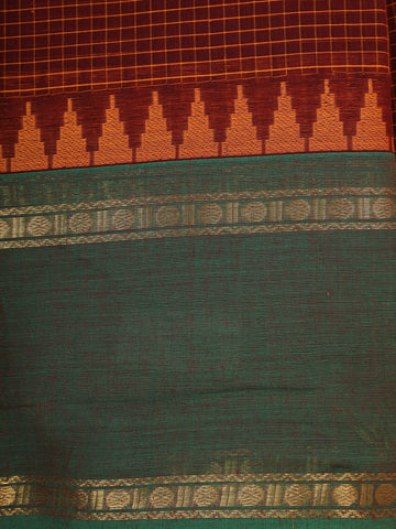 Embrace ethnic elegance with this beautifully crafted rust brown cotton saree, designed with timeless charm. The body features a refined checked pattern in subtle tones, creating a sophisticated everyday look. The standout highlight is the contrast green zari woven border enriched with traditional temple motifs and floral patterns, adding a rich cultural grace to the saree.