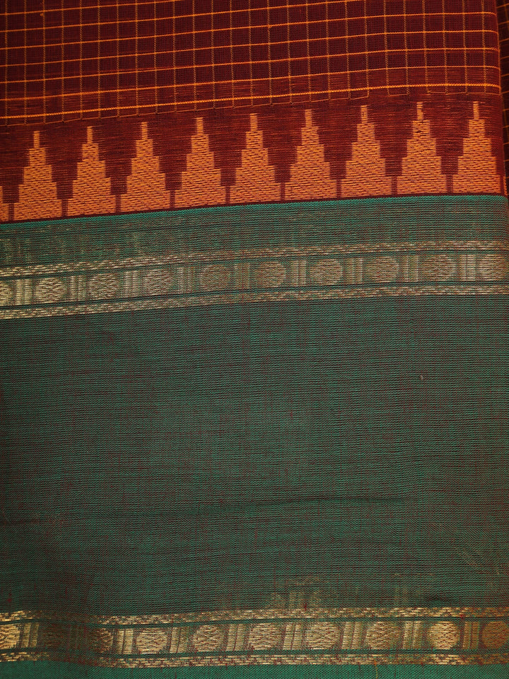 Rust Brown Checks Design Cotton Saree with Contrast Green Zari Woven Border