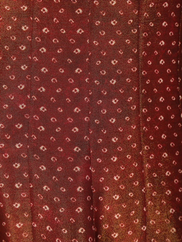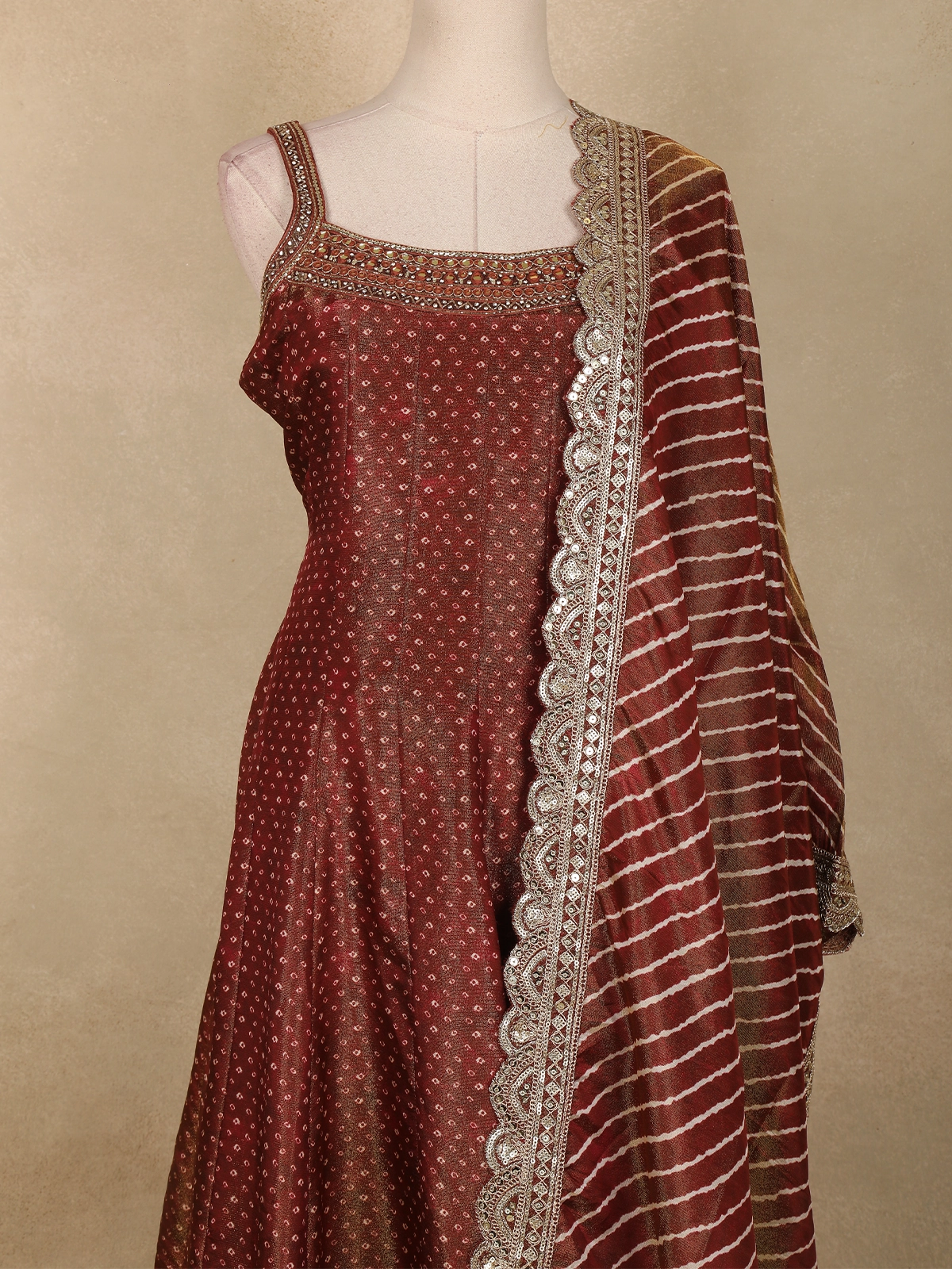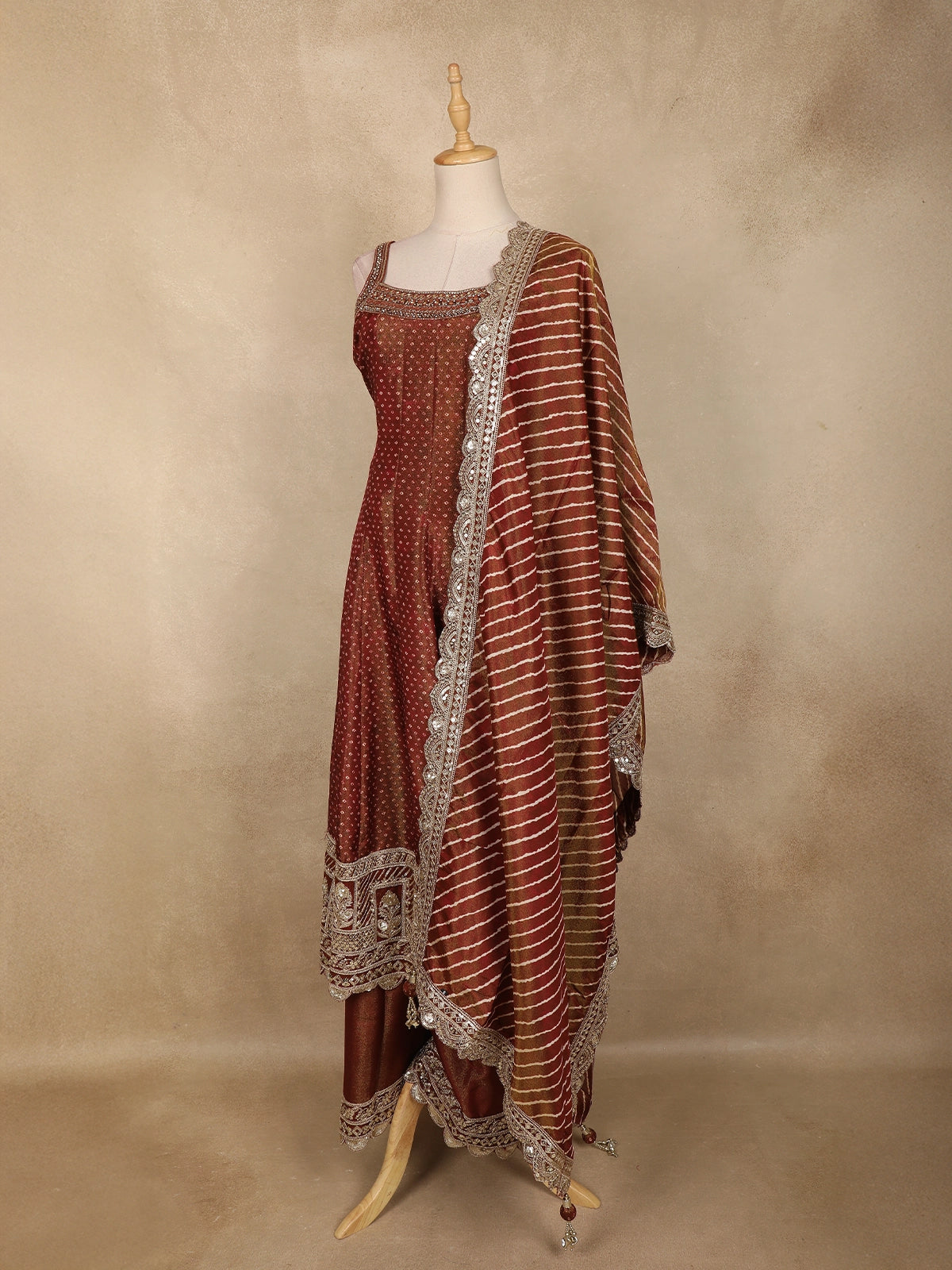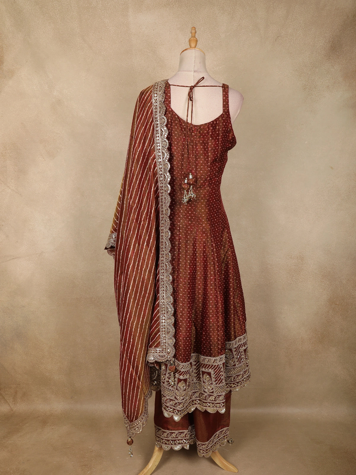 Paired with a matching tissue silk palazzo, this ensemble offers both comfort and fluid movement, creating a flattering silhouette ideal for long celebrations. Completing the look is a designer georgette dupatta, adorned with elegant striped patterns, ornate scalloped zari embroidery along the borders, and tassel detailing that adds a touch of festive charm.