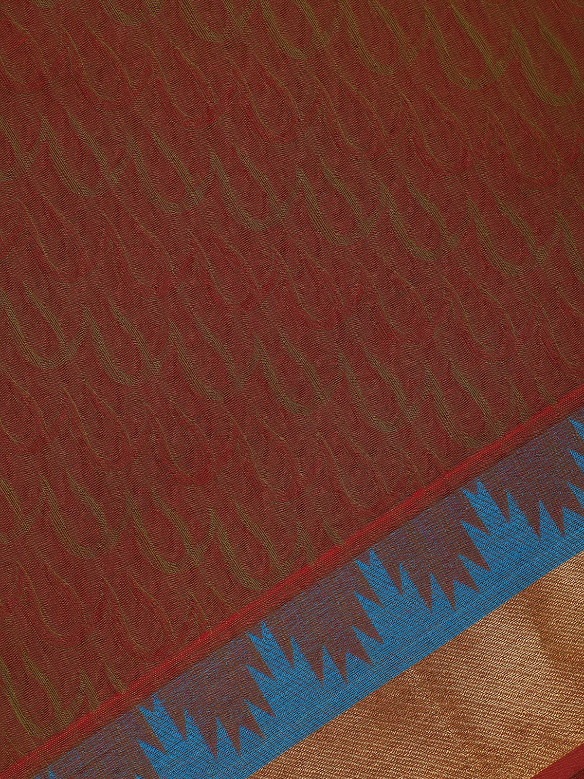 The saree showcases a wave-patterned woven design across the rust brown body, adding subtle texture and sophistication. Its golden zari border, highlighted with a vibrant blue edge, lends a striking contrast that elevates the overall look with a hint of festive charm. The matching brown pallu and blouse piece bring a seamless finish, making this saree versatile for casual wear, office dressing, or small celebrations.