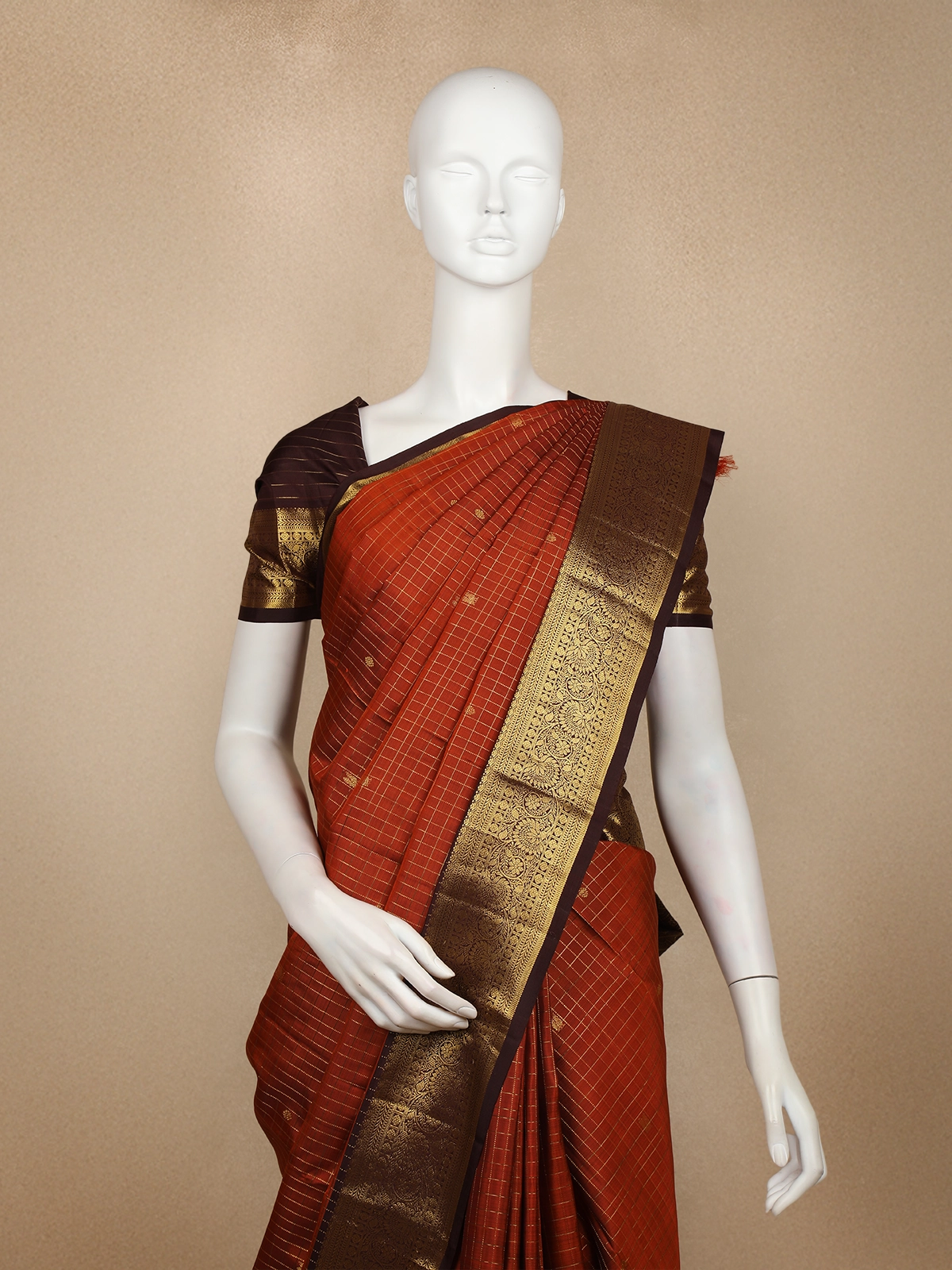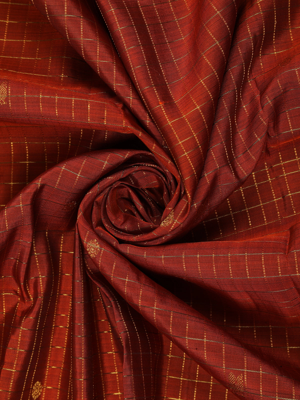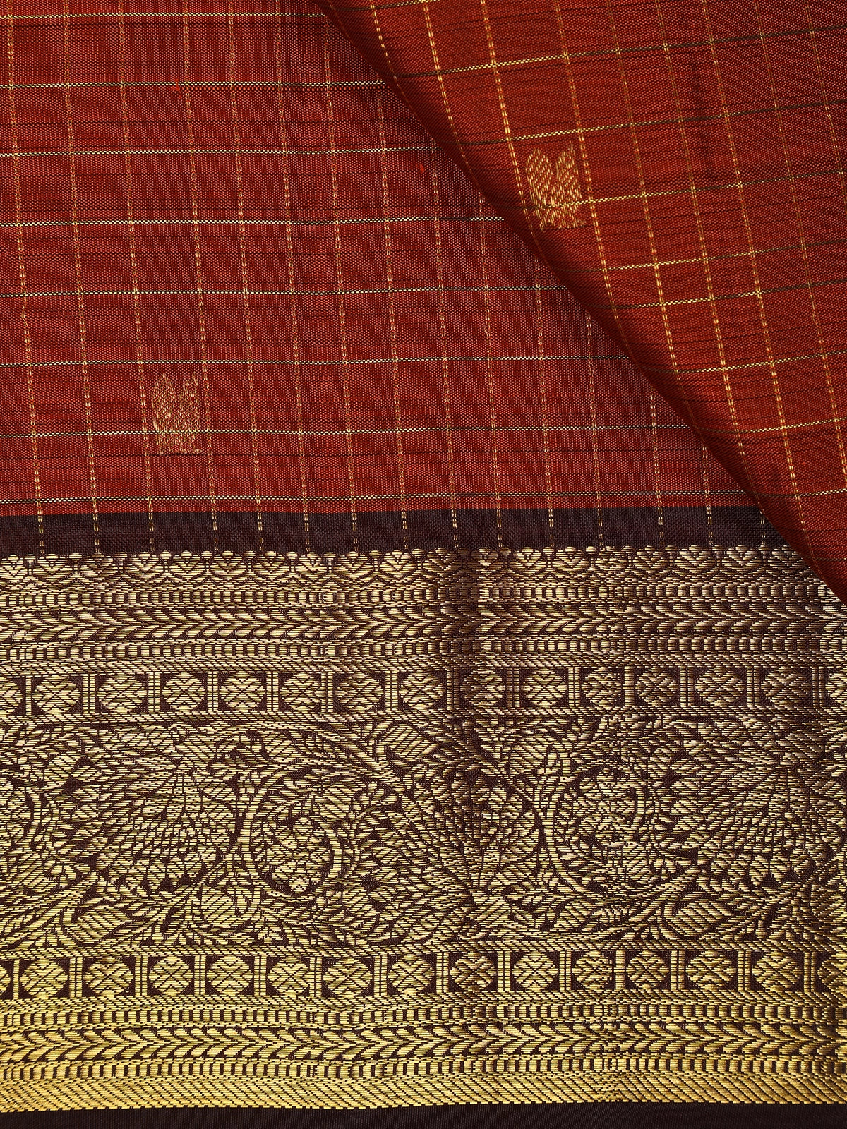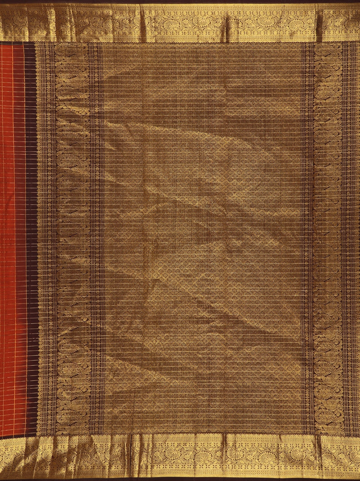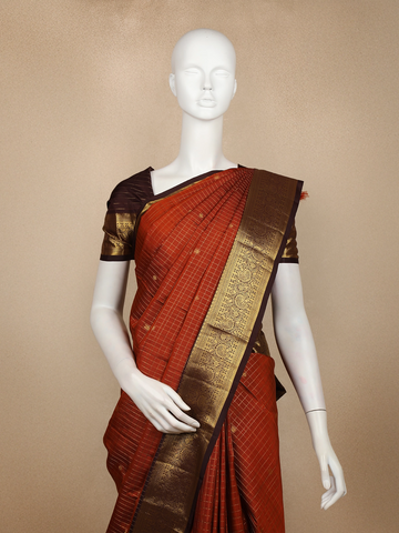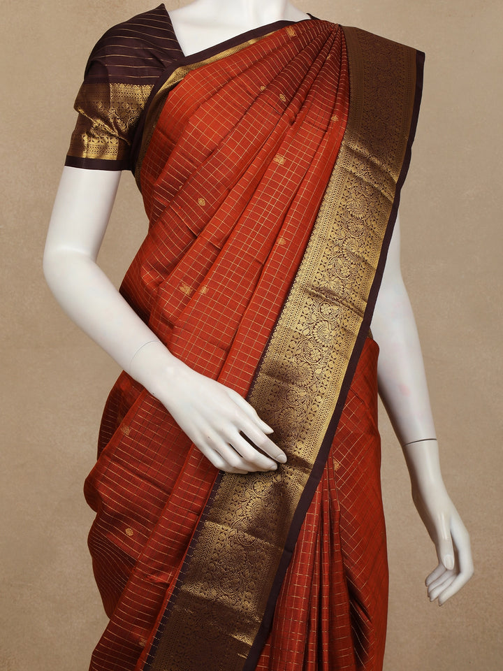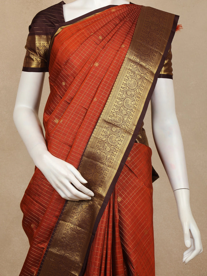 Rust Checked Woven Pure Kanchipuram Silk Saree with Zari Border