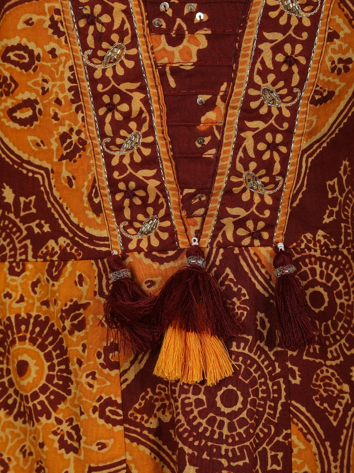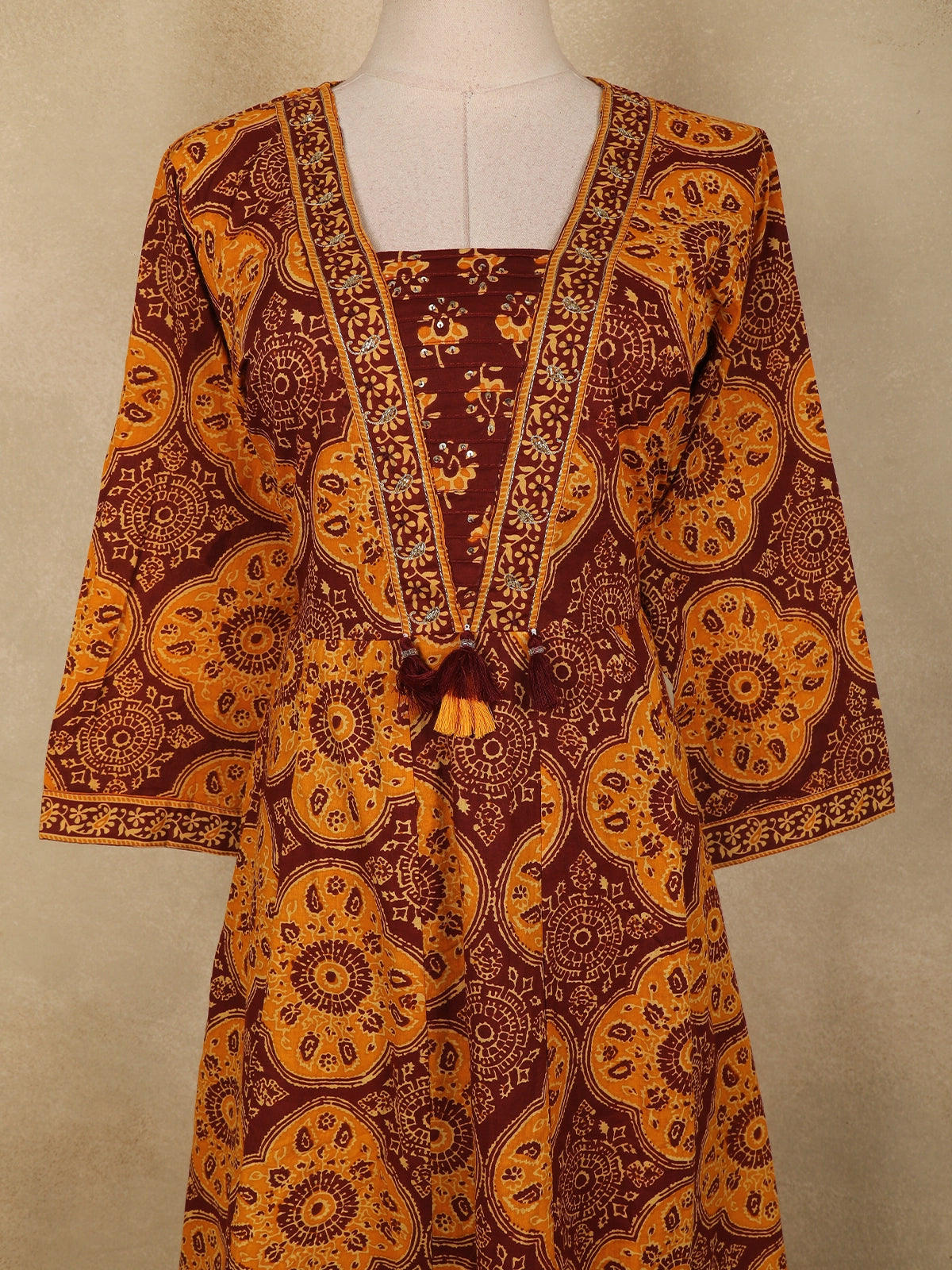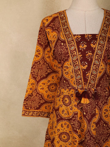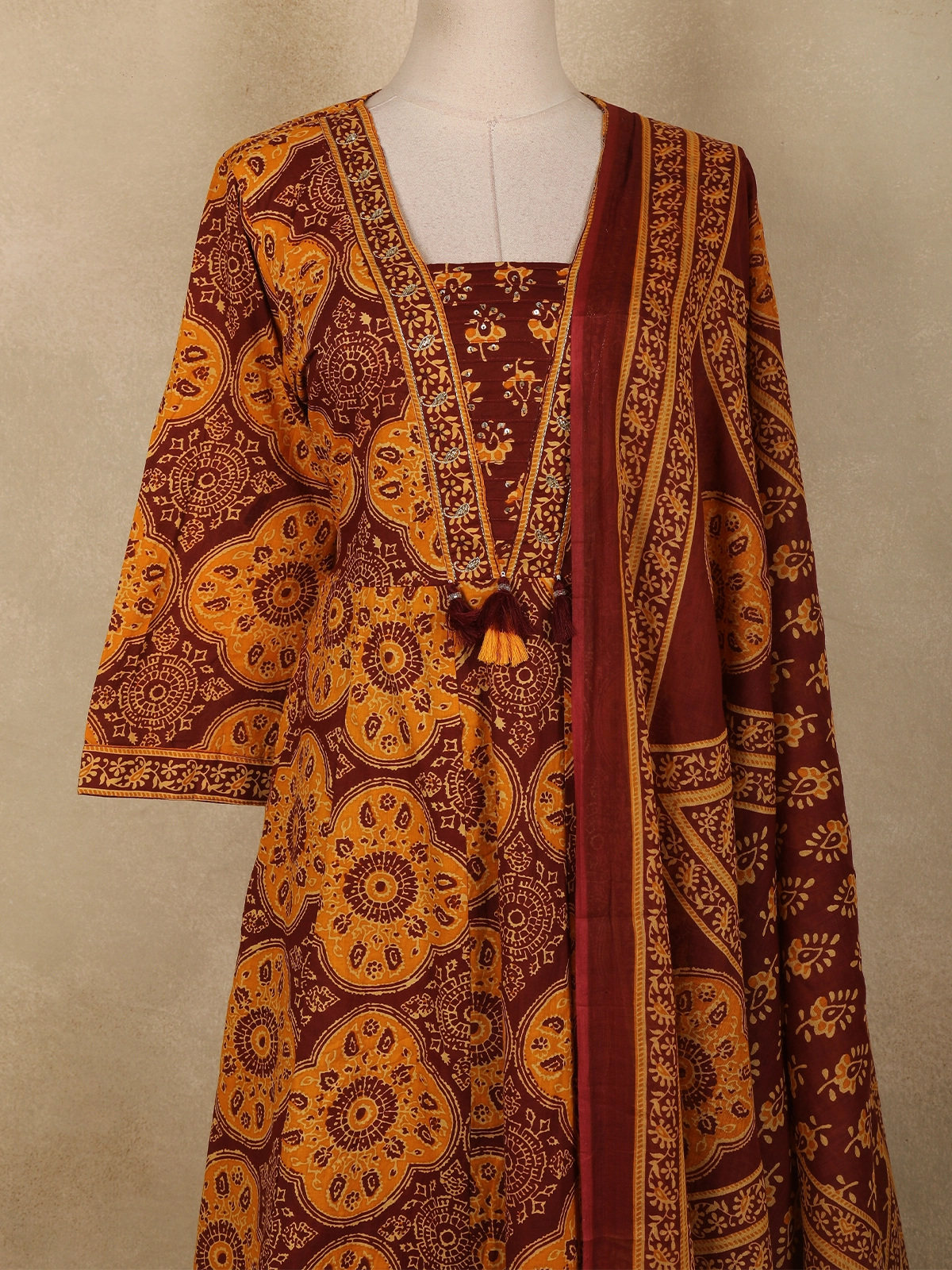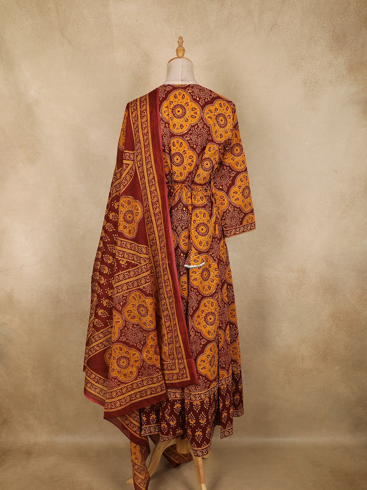 Rust Maroon Ajrakh Printed Design Cotton Anarkali Salwar Suit with Dupatta