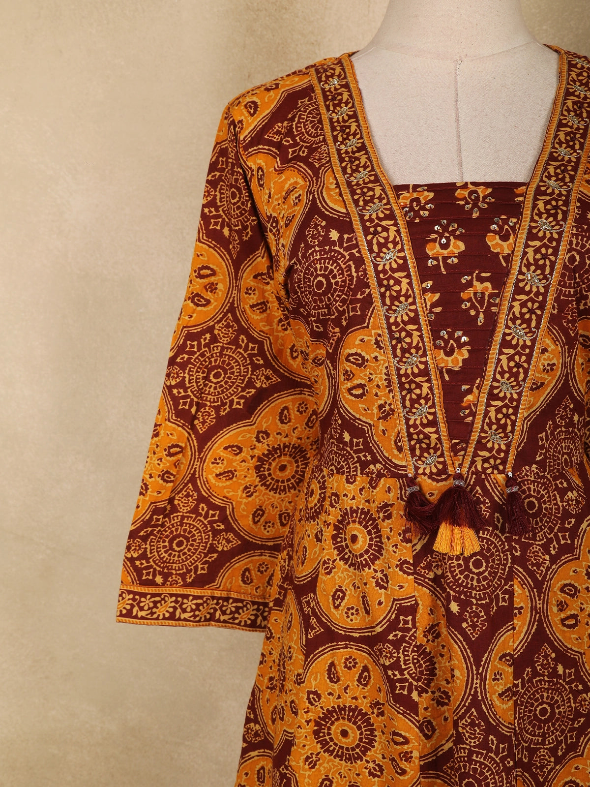 The Anarkali silhouette offers a graceful flare, enhanced by intricate ethnic motifs and contrast printed borders along the neckline, sleeves, and hem. The neckline is finished with a decorative tie-up detail with tassels, adding a subtle handcrafted touch. Paired with a matching cotton salwar, the ensemble ensures comfort without compromising on style. Completing the look is a coordinated Ajrakh printed dupatta, highlighted with richly patterned borders for a cohesive and elegant finish.