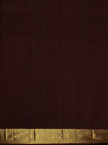 The contrast brown pallu, intricately woven with shimmering zari, adds depth and grandeur to the drape. Completing the look is a rich contrast brown blouse designed with zari sleeve detailing, offering the perfect blend of vibrance and sophistication.