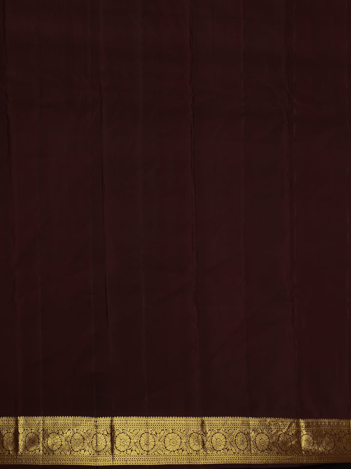 Celebrate the essence of tradition with this Orange Pure Kanchipuram Silk Saree, a masterpiece woven to perfection. The vibrant orange body is enhanced with elegant butta woven motifs that reflect the artistry of skilled weavers. Framed with a striking contrast brown zari border, the saree carries an aura of timeless elegance.