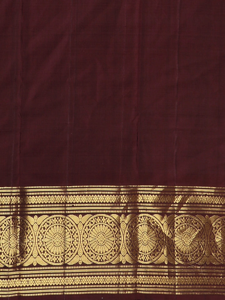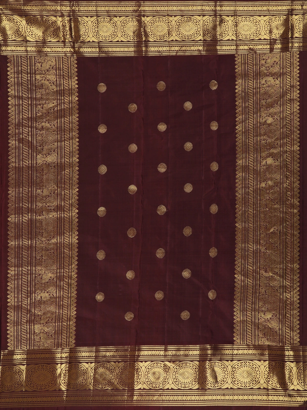 The body is adorned with classic circular butta motifs woven in pure zari, showcasing the finesse of Kanchipuram weaving traditions.