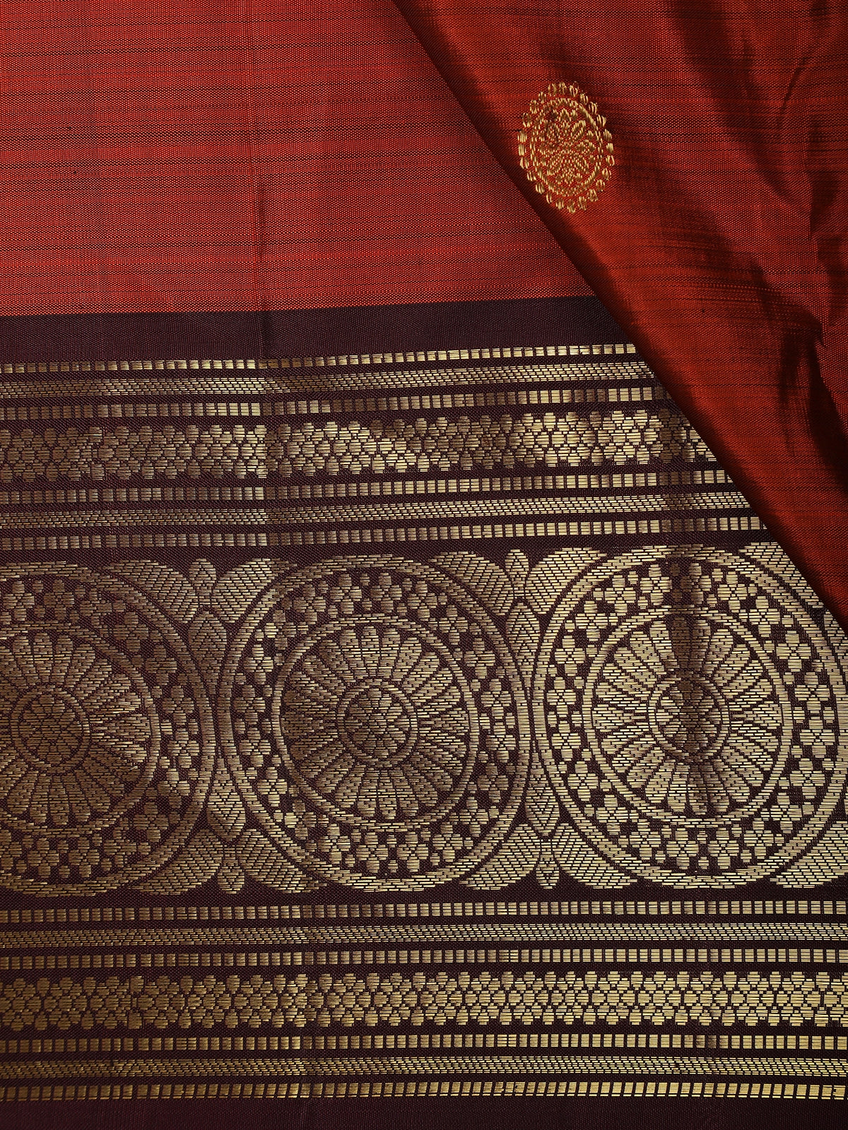 The interplay of rust and maroon brings a classic South Indian color harmony.