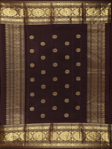 Crafted from pure Kanchipuram silk, the saree showcases delicate gold zari butta motifs woven gracefully across the body, adding subtle sparkle and classic detailing. The natural sheen and structured drape of the silk enhance the depth of the colour, creating an elegant and poised silhouette.