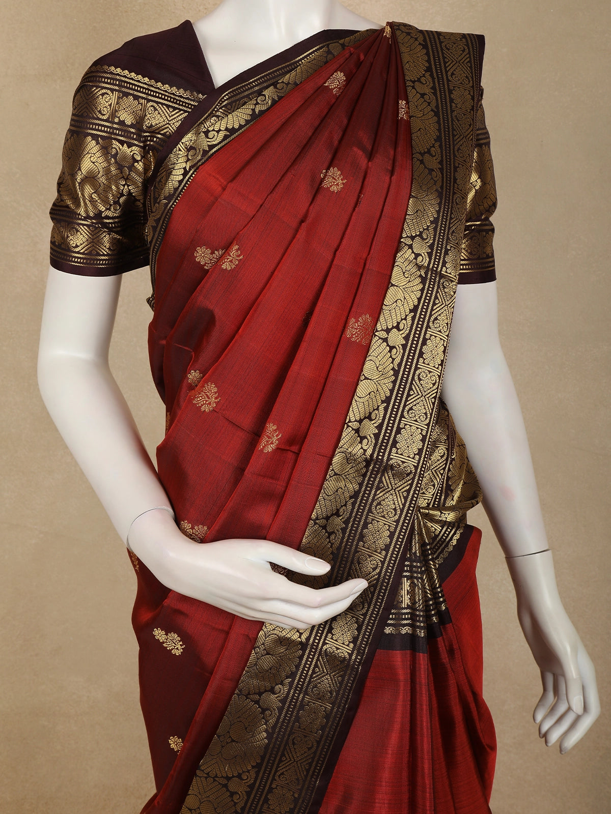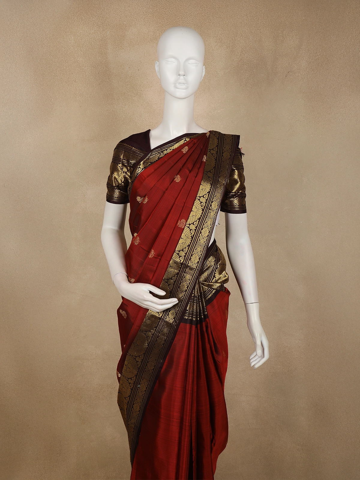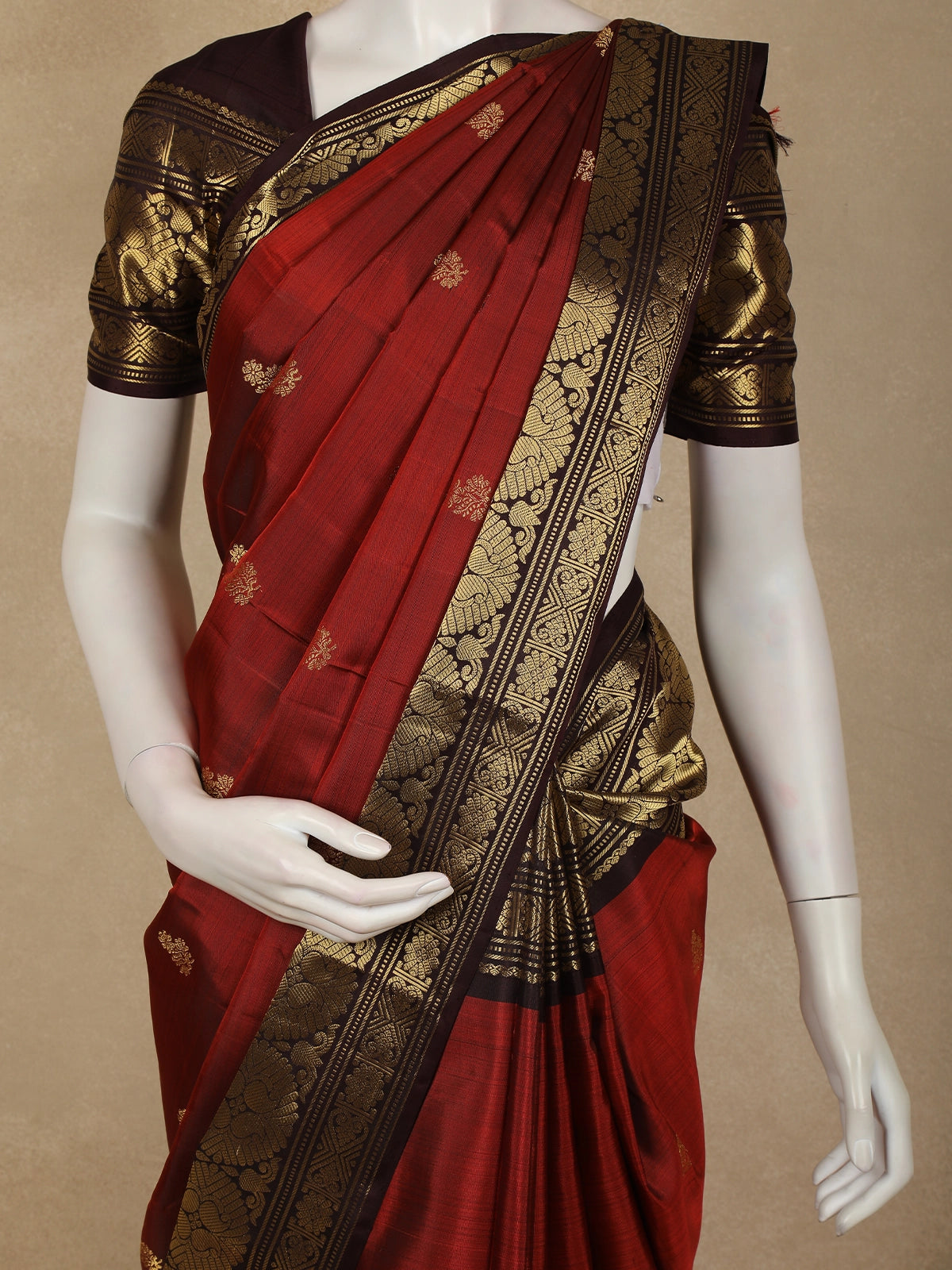 The saree is elevated with a bold contrast zari border in blackened gold, intricately woven with traditional patterns that lend a majestic finish. This striking border beautifully frames the warm body colour, adding depth, contrast, and a strong heritage appeal. The coordinated pallu and matching blouse with zari accents complete the ensemble.