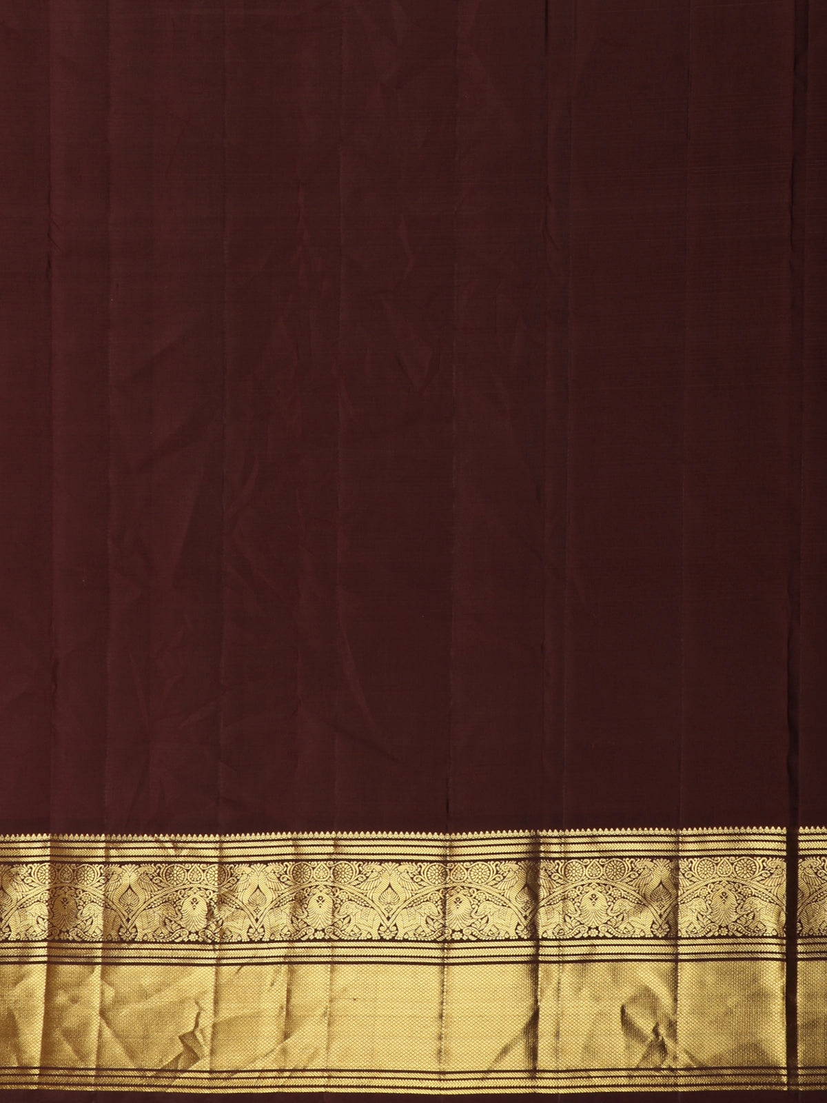 Crafted from authentic pure Kanchipuram silk, the saree showcases a lustrous texture and a graceful, structured drape that enhances its regal appeal. The broad contrast zari border in antique gold beautifully frames the saree, while the richly woven pallu adds depth and ceremonial charm.