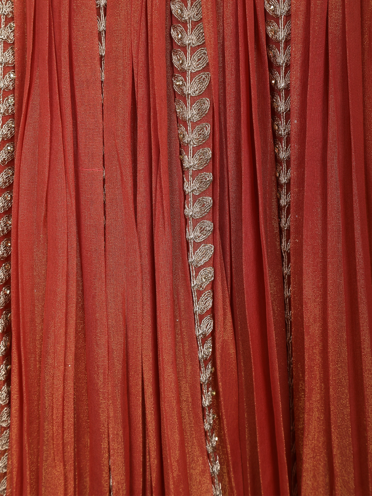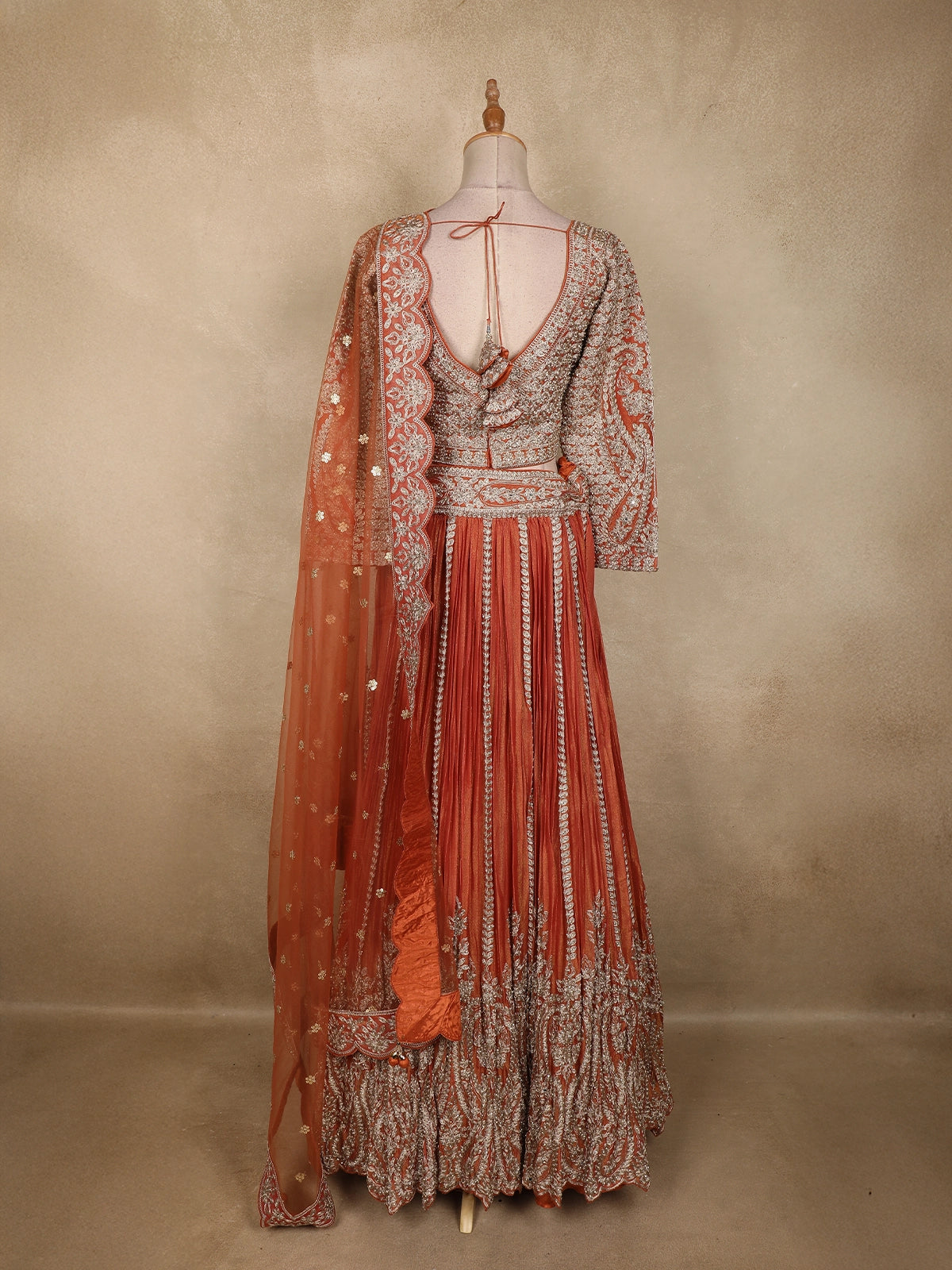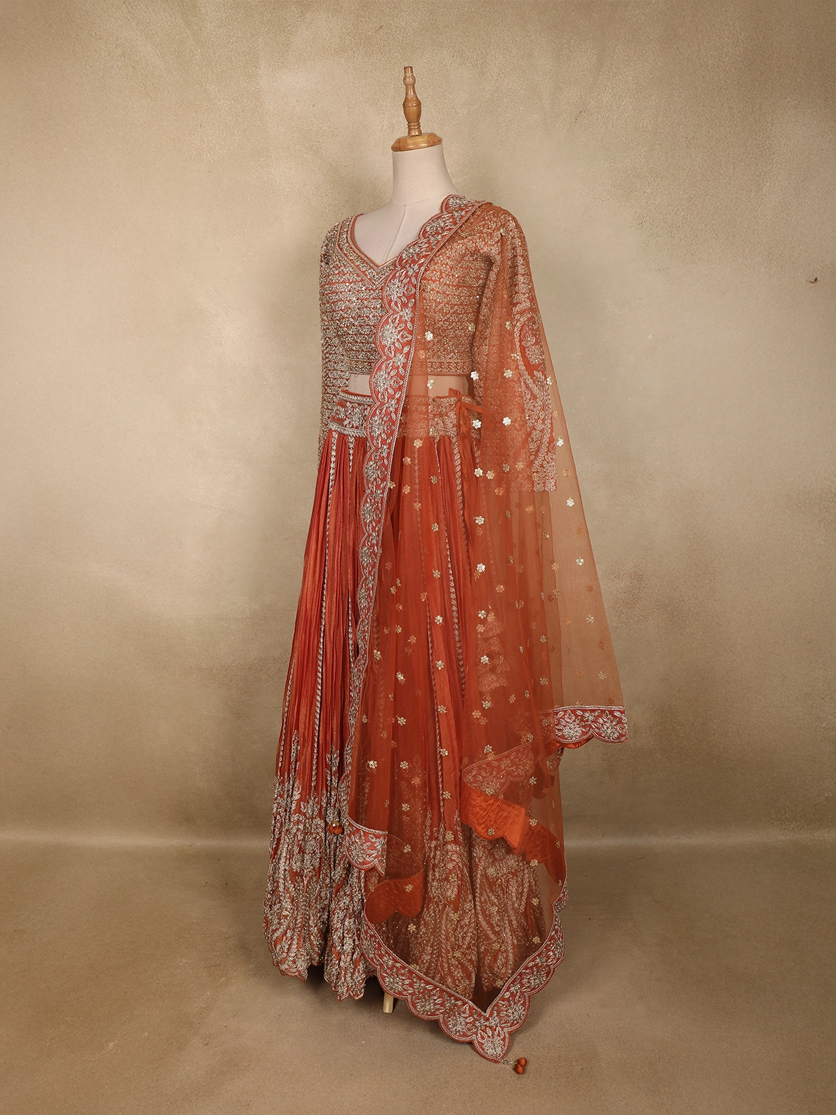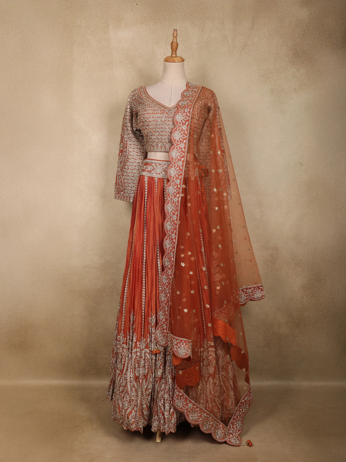 Completing the look is a matching rust orange net dupatta, delicately embroidered with floral motifs and finished with an ornate scalloped border. The sheer drape balances the richness of the lehenga, adding lightness and elegance to the overall look.