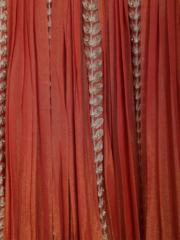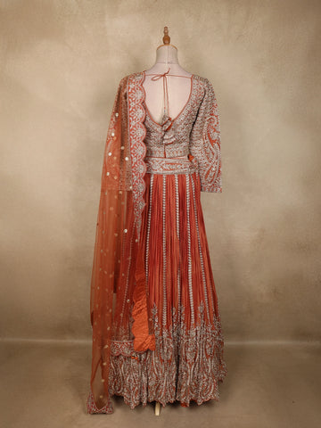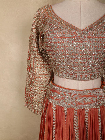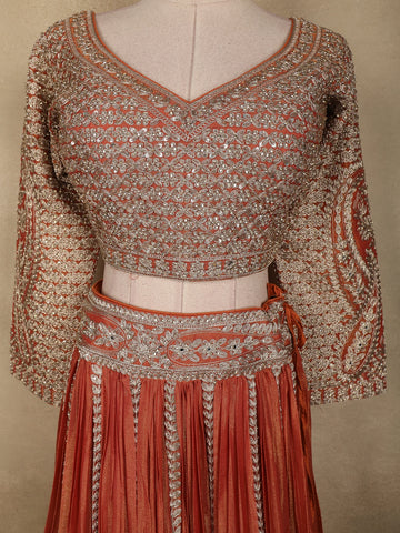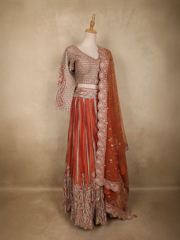 Exude timeless elegance with this stunning rust orange tissue silk designer lehenga set, crafted to celebrate intricate artistry and festive grandeur. The warm rust orange hue radiates richness and tradition, making it a perfect choice for wedding and festive occasions.