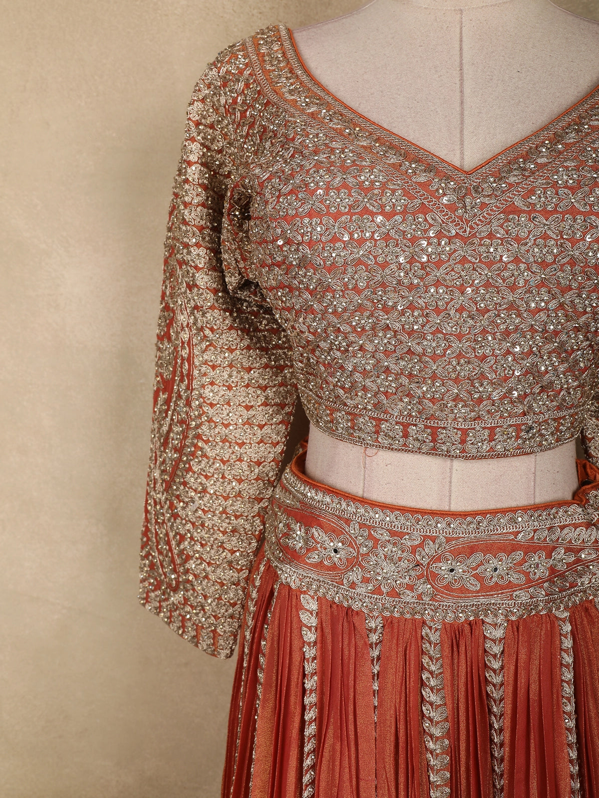 The lehenga skirt features soft pleats in lustrous tissue silk, highlighted with elaborate floral embroidery along the panels and a richly embellished hemline. The graceful flare creates a regal movement, enhancing the ensemble’s opulent appeal.