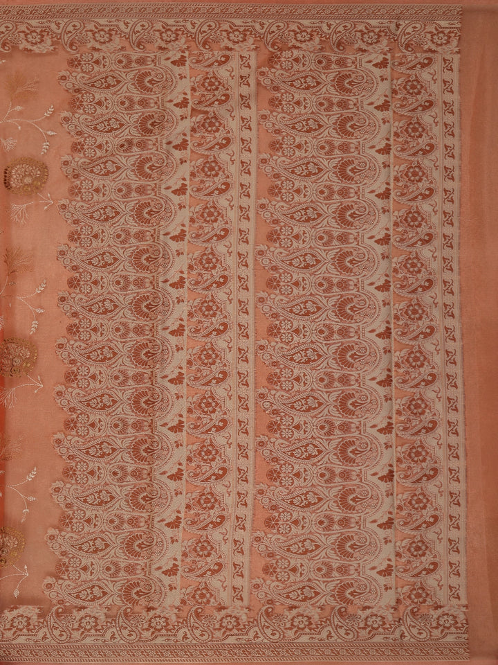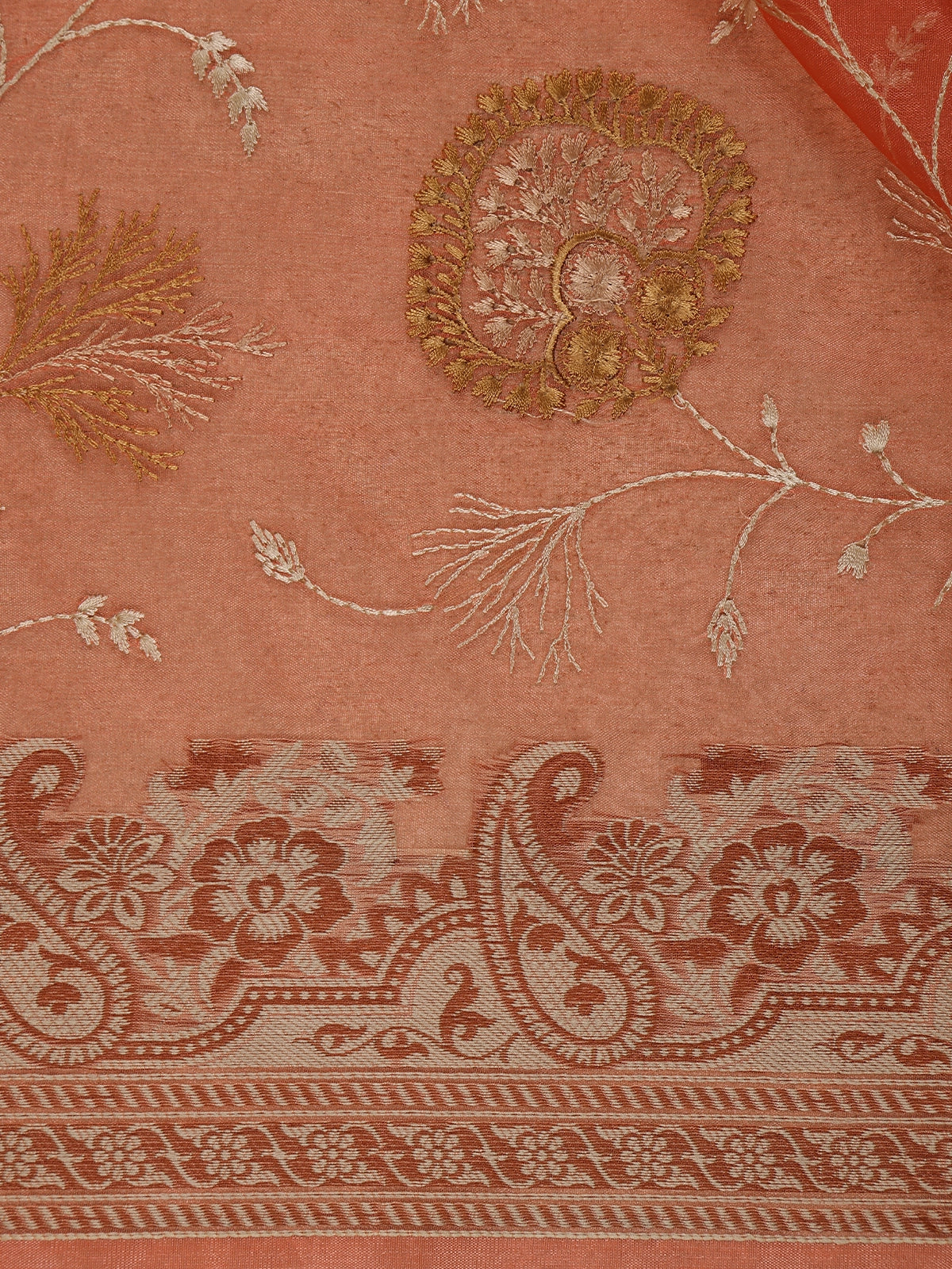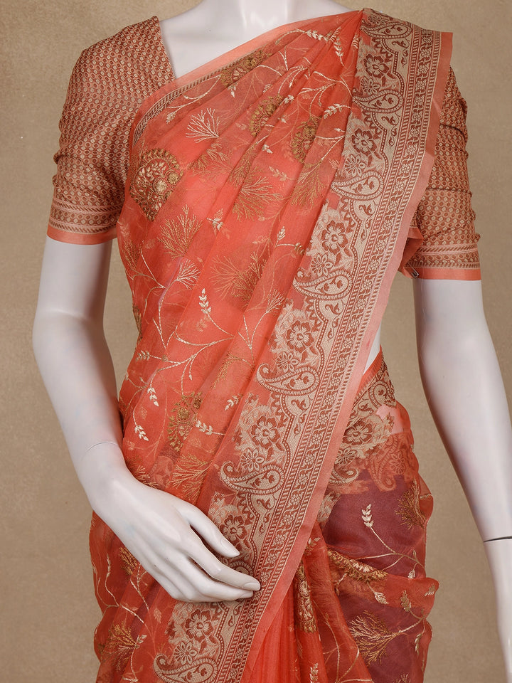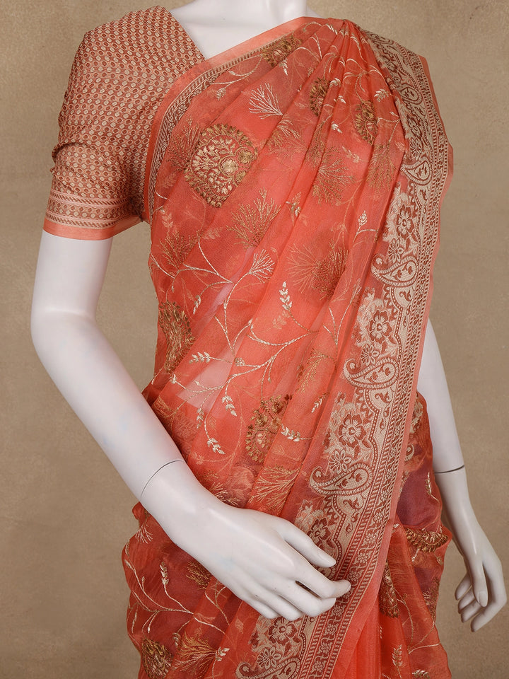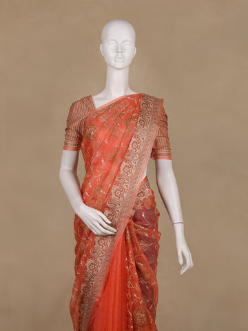 Radiate timeless elegance with this Orange Floral Embroidered Organza Saree, designed to bring a perfect blend of sophistication and charm to your festive wardrobe. Crafted from premium organza fabric, the saree features delicate floral embroidery that enhances its sheer texture with an exquisite shimmer.