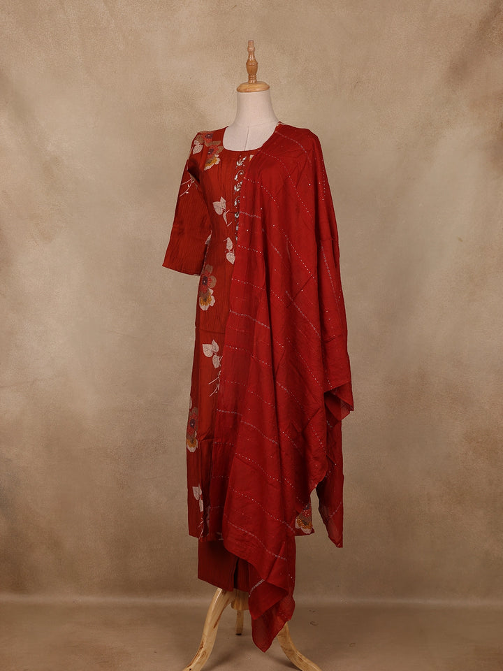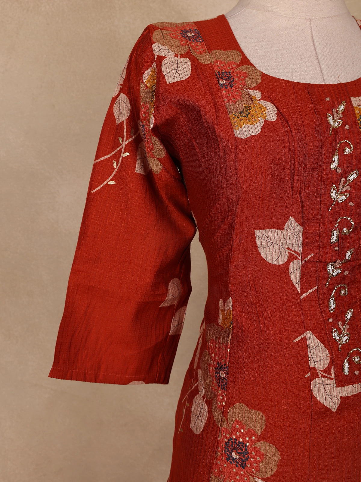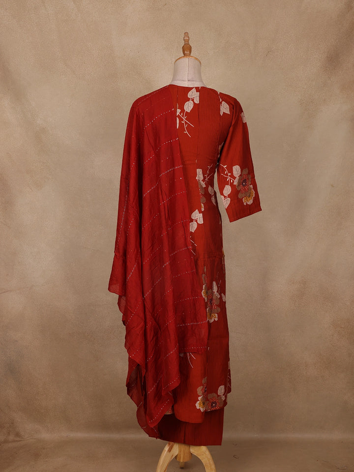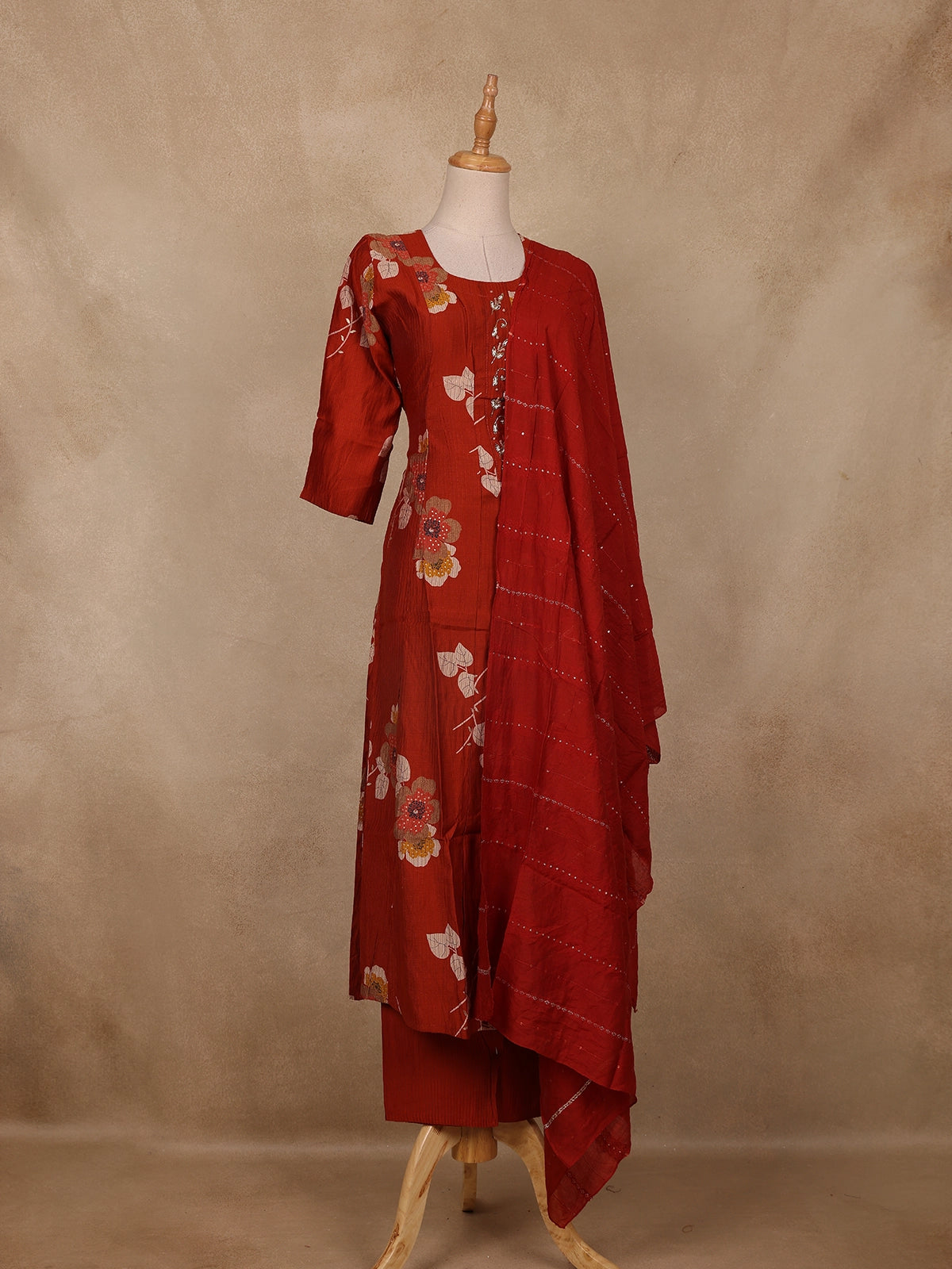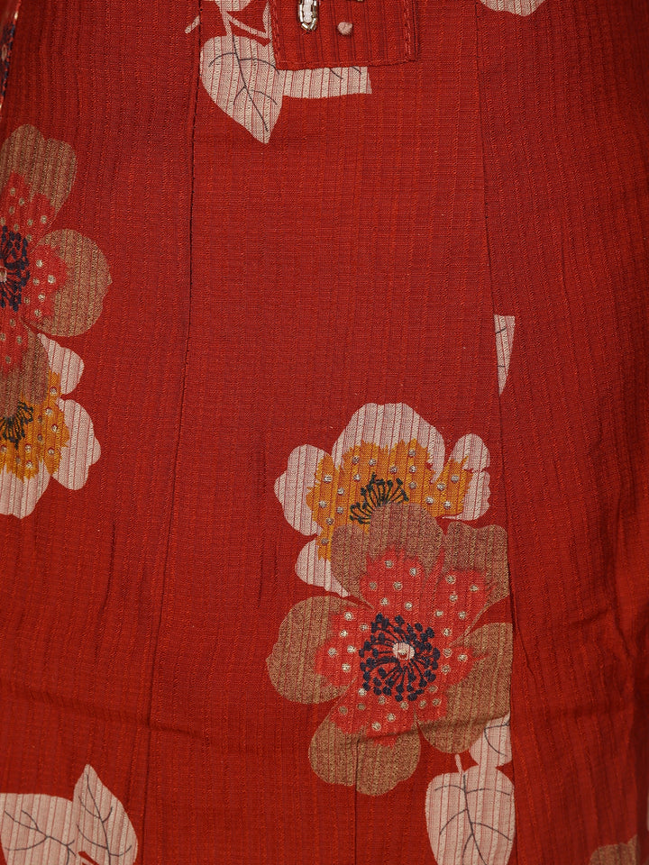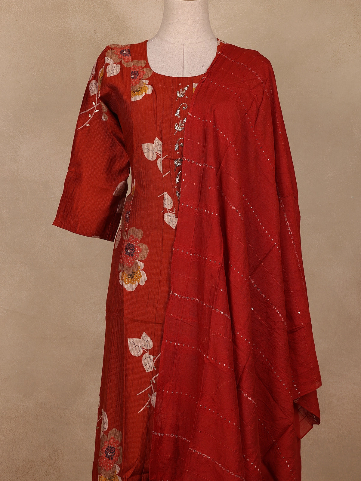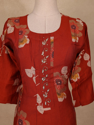 Rust Orange Floral Printed Cotton Salwar Suit with Dupatta
