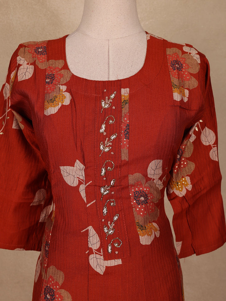 Infuse warmth and elegance into your ethnic collection with this Rust Orange Floral Printed Cotton Salwar Suit. Crafted from soft, breathable cotton, this ensemble showcases an intricate floral print that adds a touch of timeless grace.
