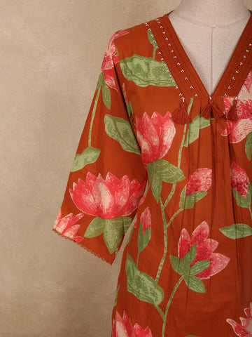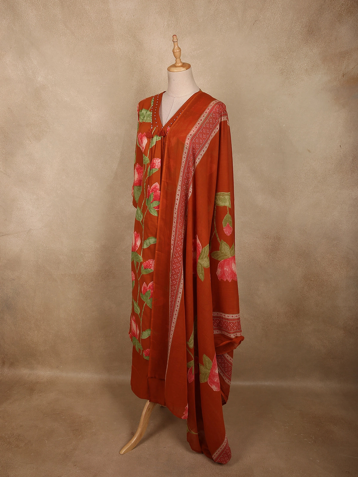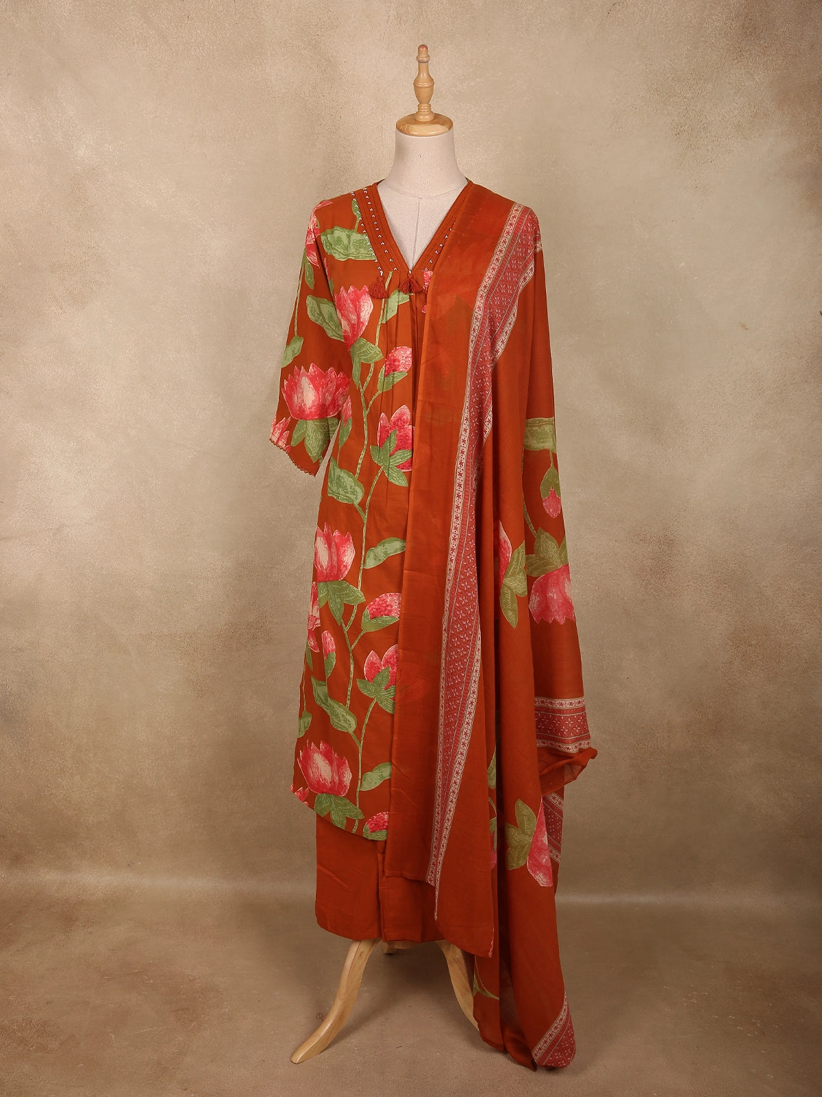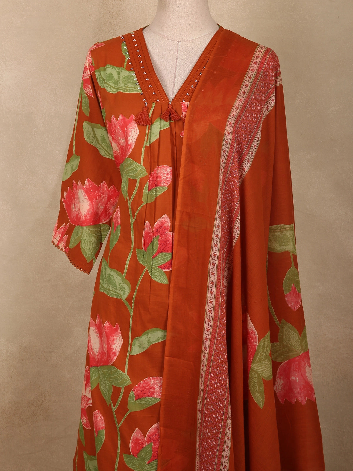 Elevate your everyday ethnic style with this Rust Orange Cotton Salwar Suit, a perfect blend of graceful color and artistic detailing. The rich wine-toned base is beautifully brought to life with oversized floral prints, adding a fresh yet elegant contrast that enhances the overall visual appeal.