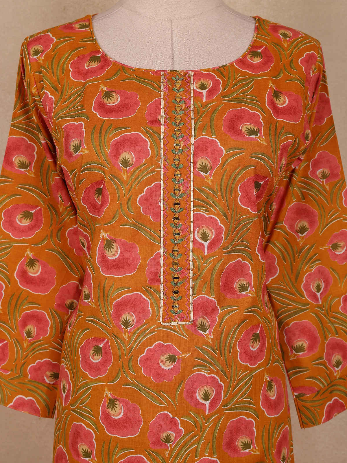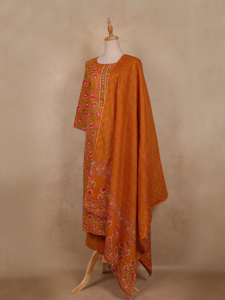 Bring warmth and vibrance to your ethnic wardrobe with this Rust Orange Floral Printed Cotton Straight Cut Salwar Suit, a beautiful fusion of tradition and comfort. Crafted from fine-quality cotton fabric, this ensemble features elegant floral prints in soothing tones of pink and green, creating a refreshing contrast against the rich rust-orange backdrop.