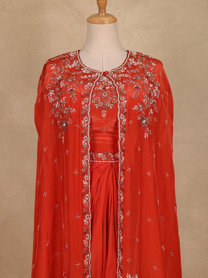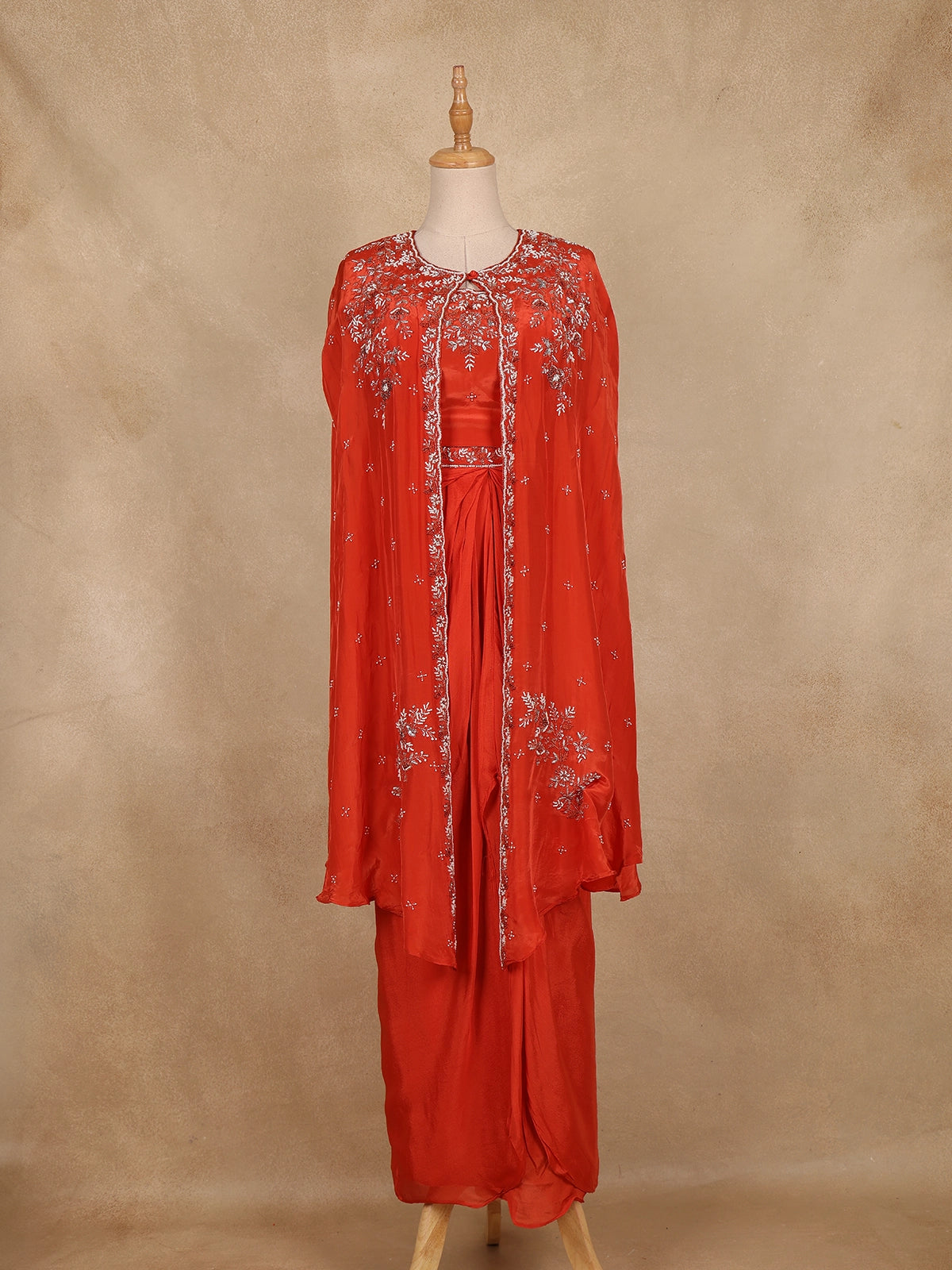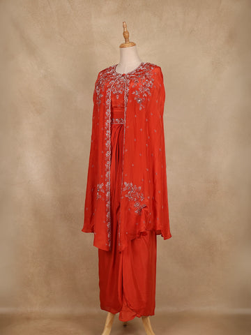 Step into elegance with this Rust Orange Floral Sequins Embroidered Chiffon Skirt Top with Jacket, a perfect blend of festive charm and contemporary sophistication.
