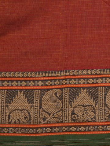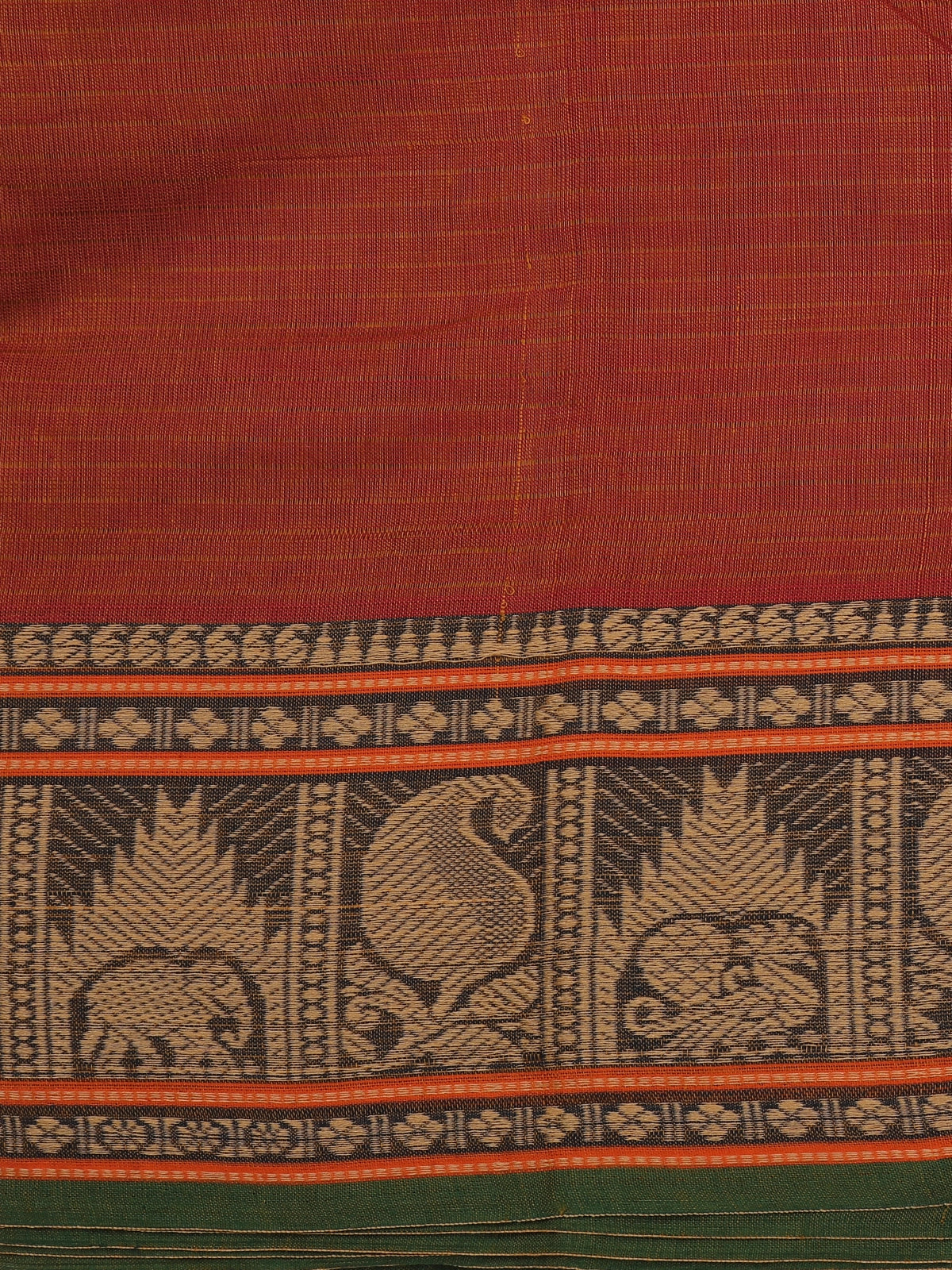 Elevate your traditional wardrobe with this elegant rust orange art silk saree, beautifully woven with intricate peacock and floral zari motifs along the border. The warm rust body carries a subtle textured weave that enhances its classic charm, while the contrast green edging adds a refreshing pop of colour. The gold zari border features detailed peacock motifs framed in traditional temple-inspired panels, giving the saree a timeless South Indian appeal. Soft, lightweight, and perfect for festive occasions, poojas, and cultural celebrations, this saree offers a graceful drape with a heritage touch. Pair it with traditional jewellery for a complete ethnic ensemble.
