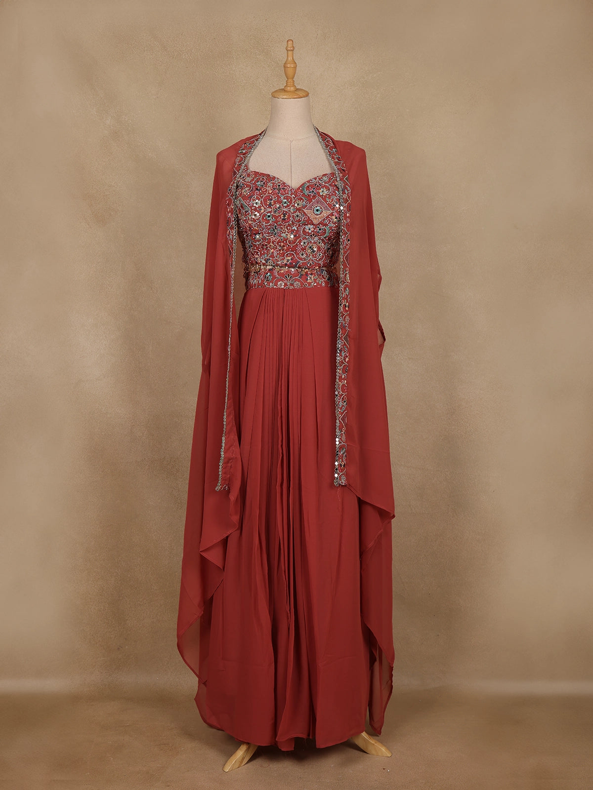 The coordinated georgette skirt flows gracefully, offering effortless movement and a luxurious drape. Completing the ensemble is a matching embroidered cape dupatta, adding a contemporary flair and ethereal touch to the outfit. Perfect for festive celebrations, weddings, or special evenings, this ensemble beautifully balances modern design with traditional artistry.