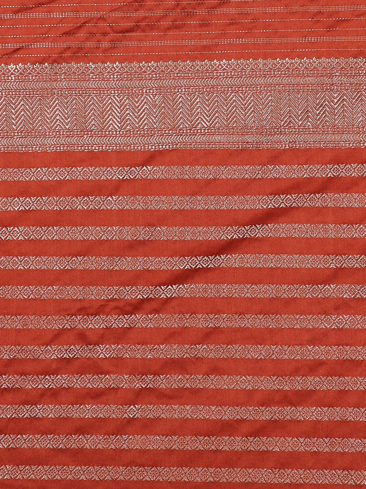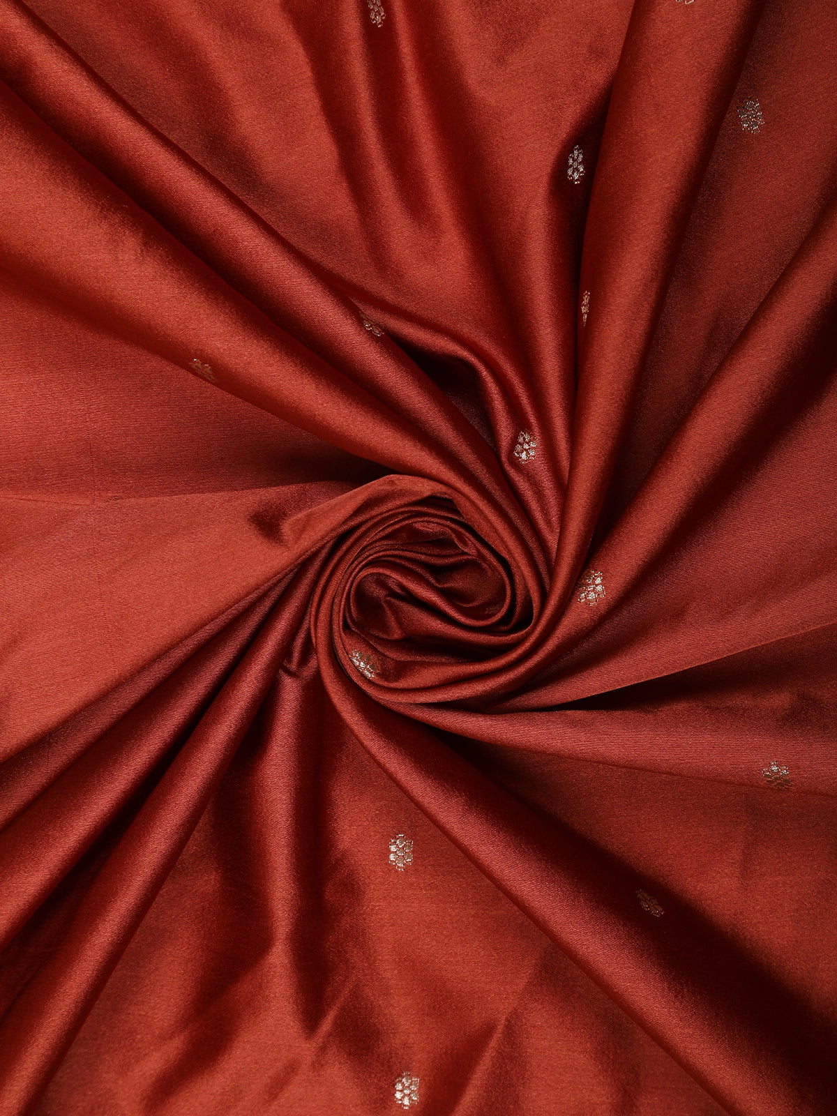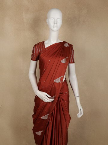 Crafted from pure Banarasi silk, the saree offers a luxurious sheen and a fluid, graceful drape that enhances its regal appeal. The interplay of the rich rust red base with soft zari highlights creates a harmonious contrast that feels both classic and contemporary.