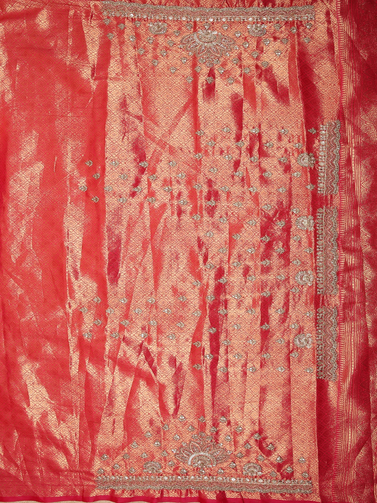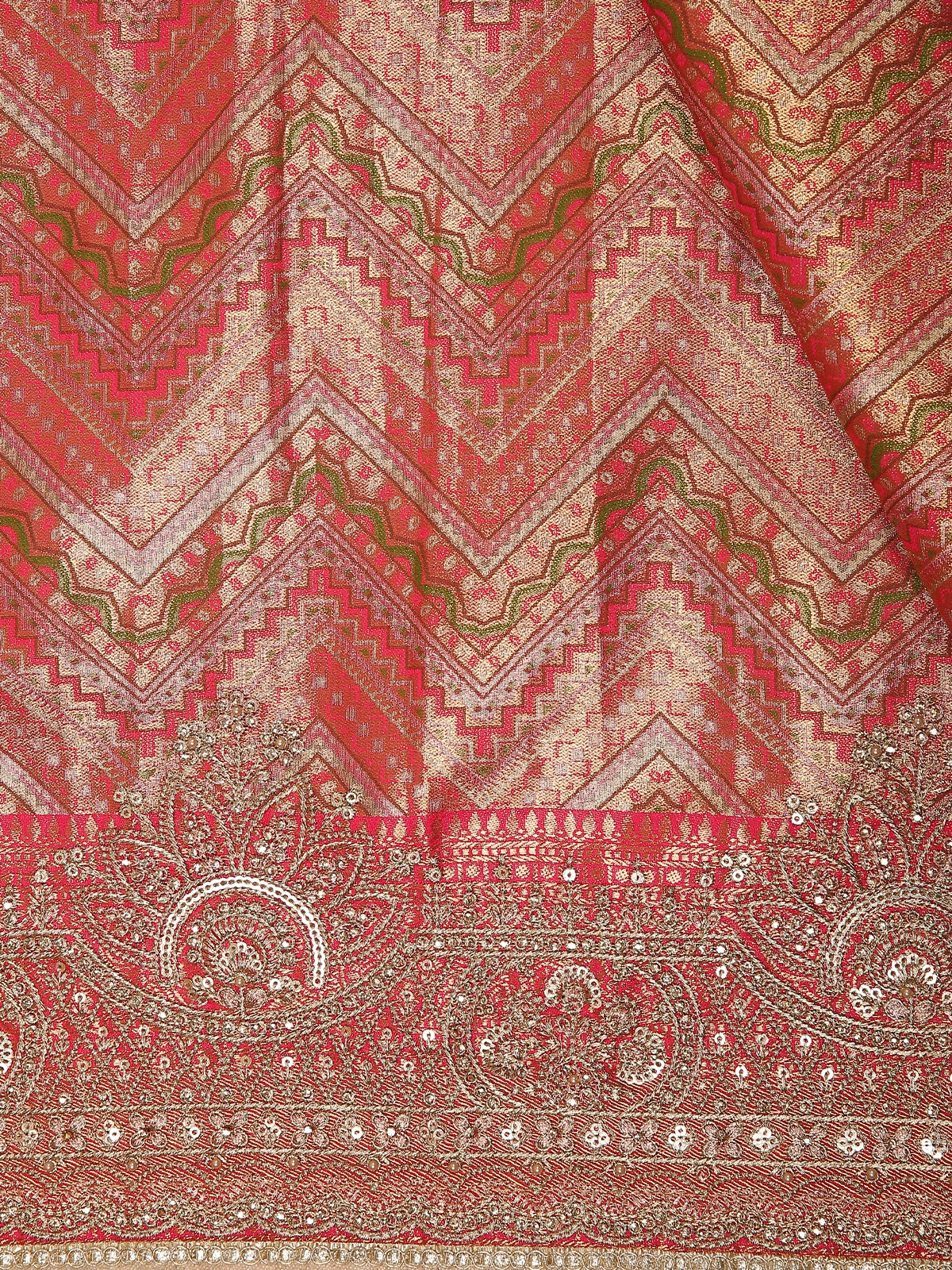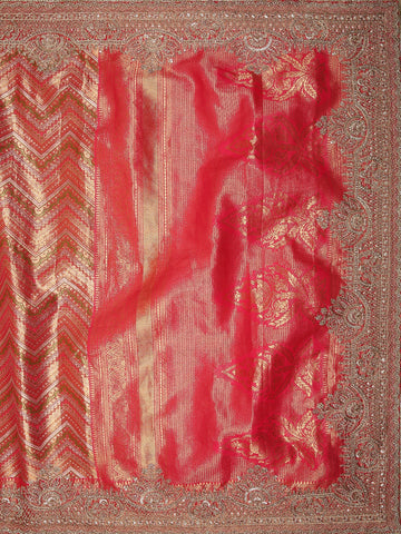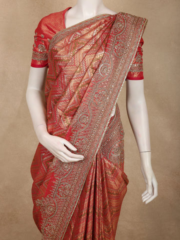 Rusty Red Abstract Sequins and Zari Embroidered Design Tissue Banarasi Saree with Designer Border