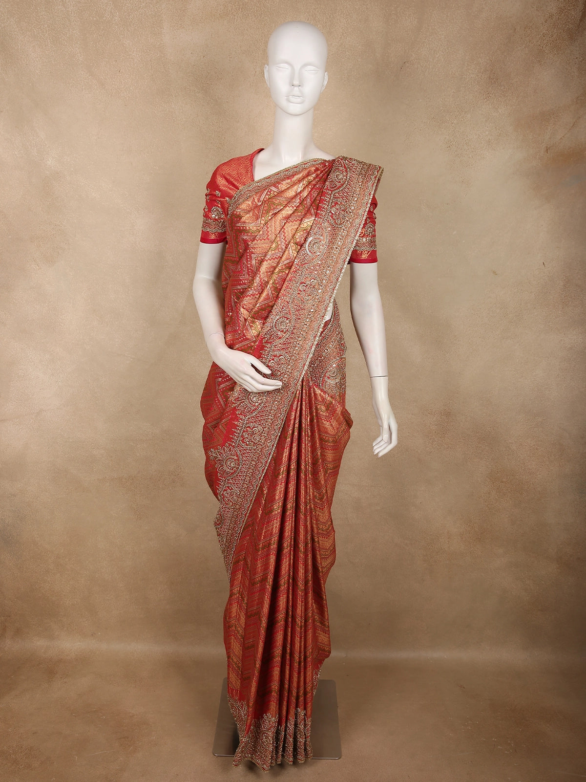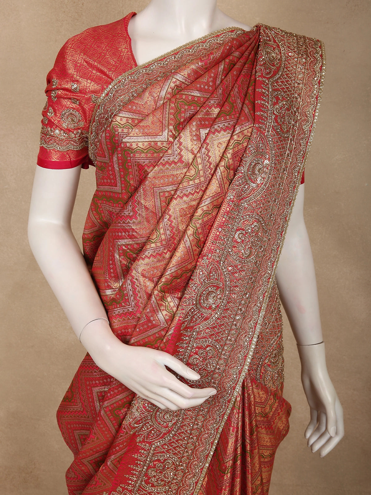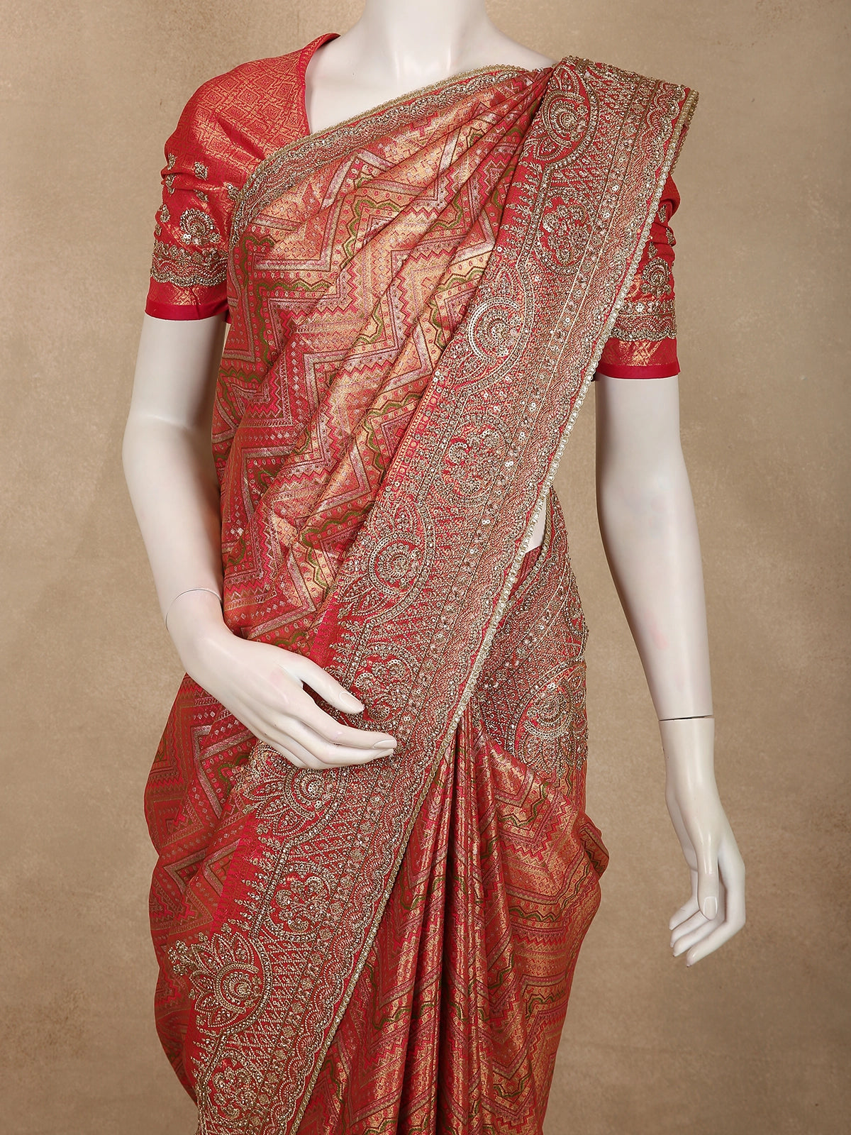 A statement ensemble that blends traditional Banarasi craftsmanship with contemporary elegance, designed to leave a lasting impression.
