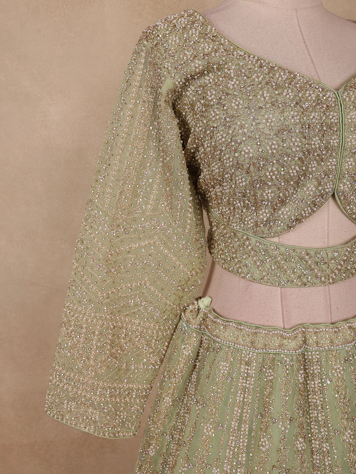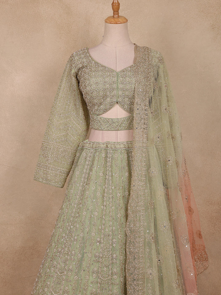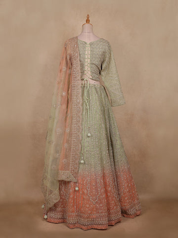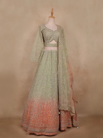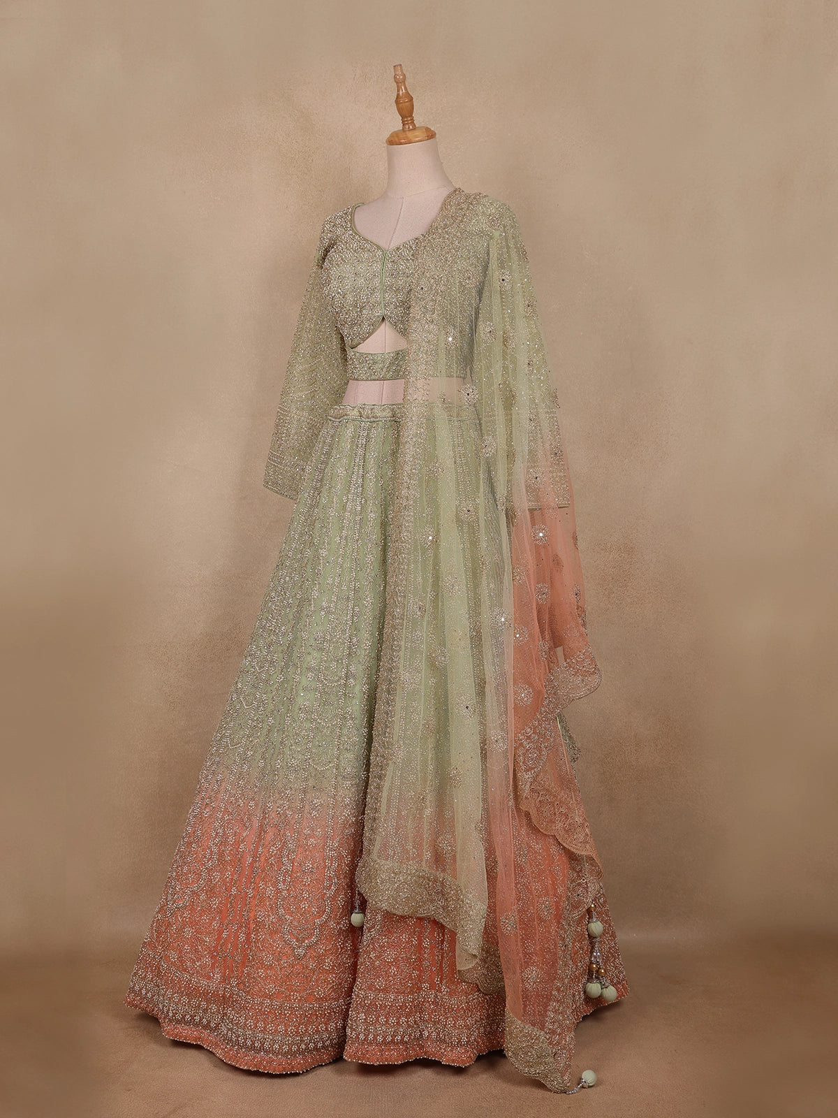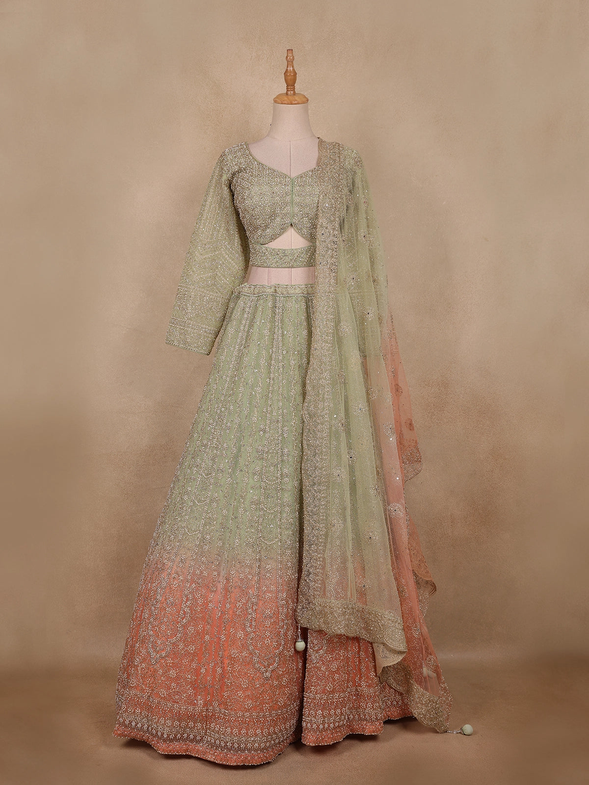 Sage Green and Peach Ombre Sequins Embroidered Design Net Lehenga with Dupatta