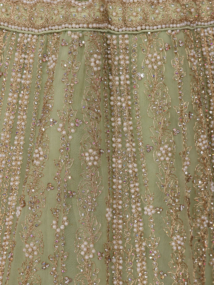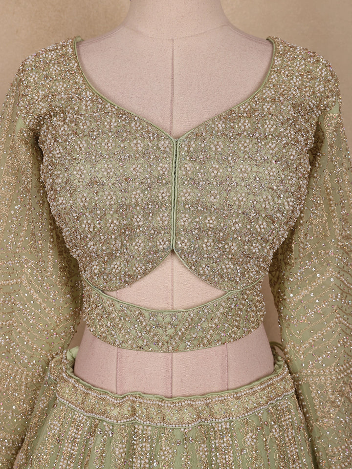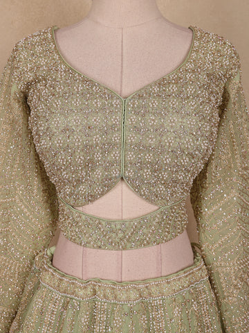 Crafted from premium net fabric, the ensemble is adorned with delicate sequin and thread embroidery arranged in ornate patterns that shimmer gracefully with every movement. The sweetheart neckline blouse features refined embellishments, while the full sleeves add a regal and balanced appeal. The voluminous flared lehenga skirt enhances the silhouette, making it ideal for grand celebrations.
