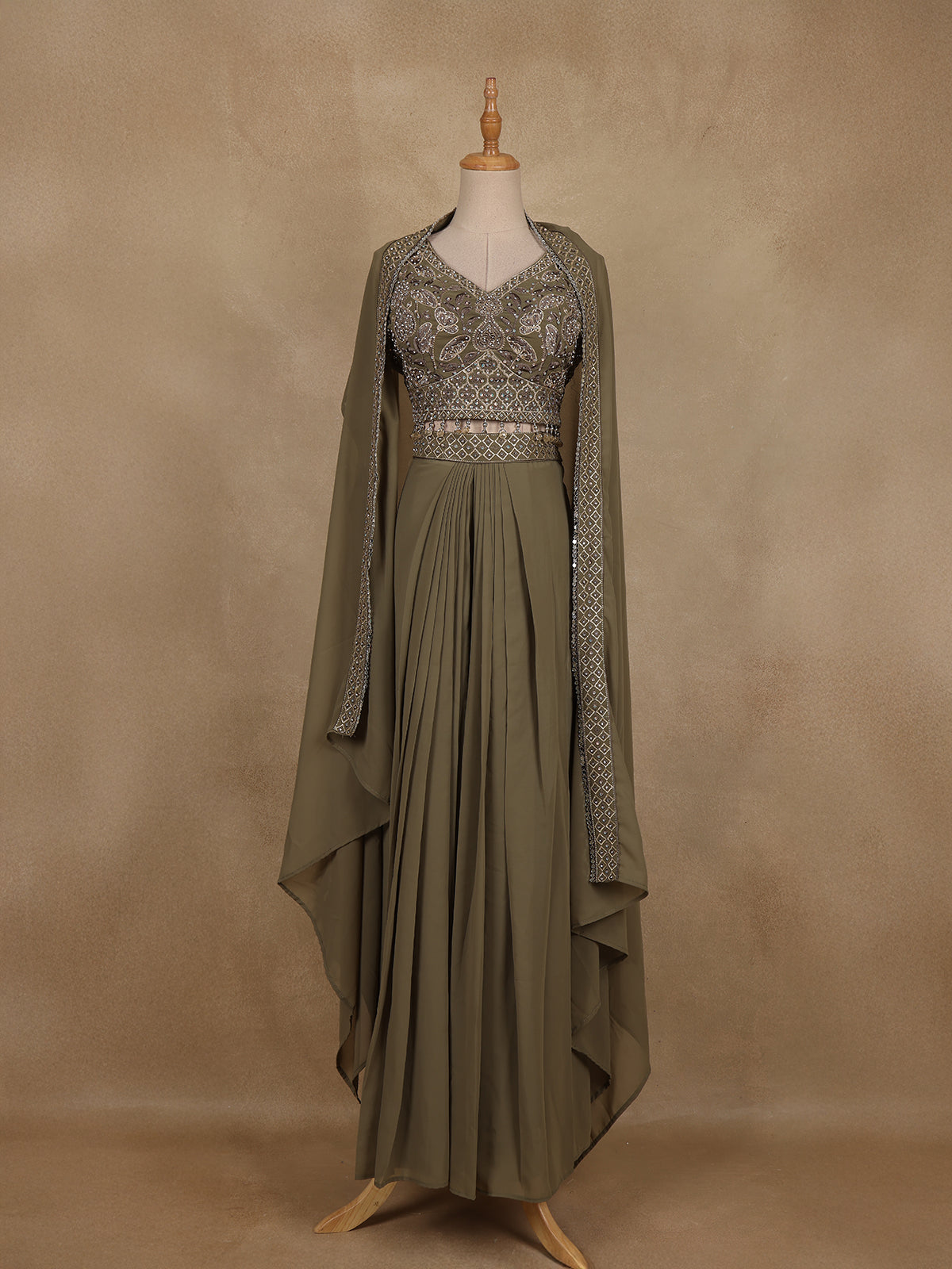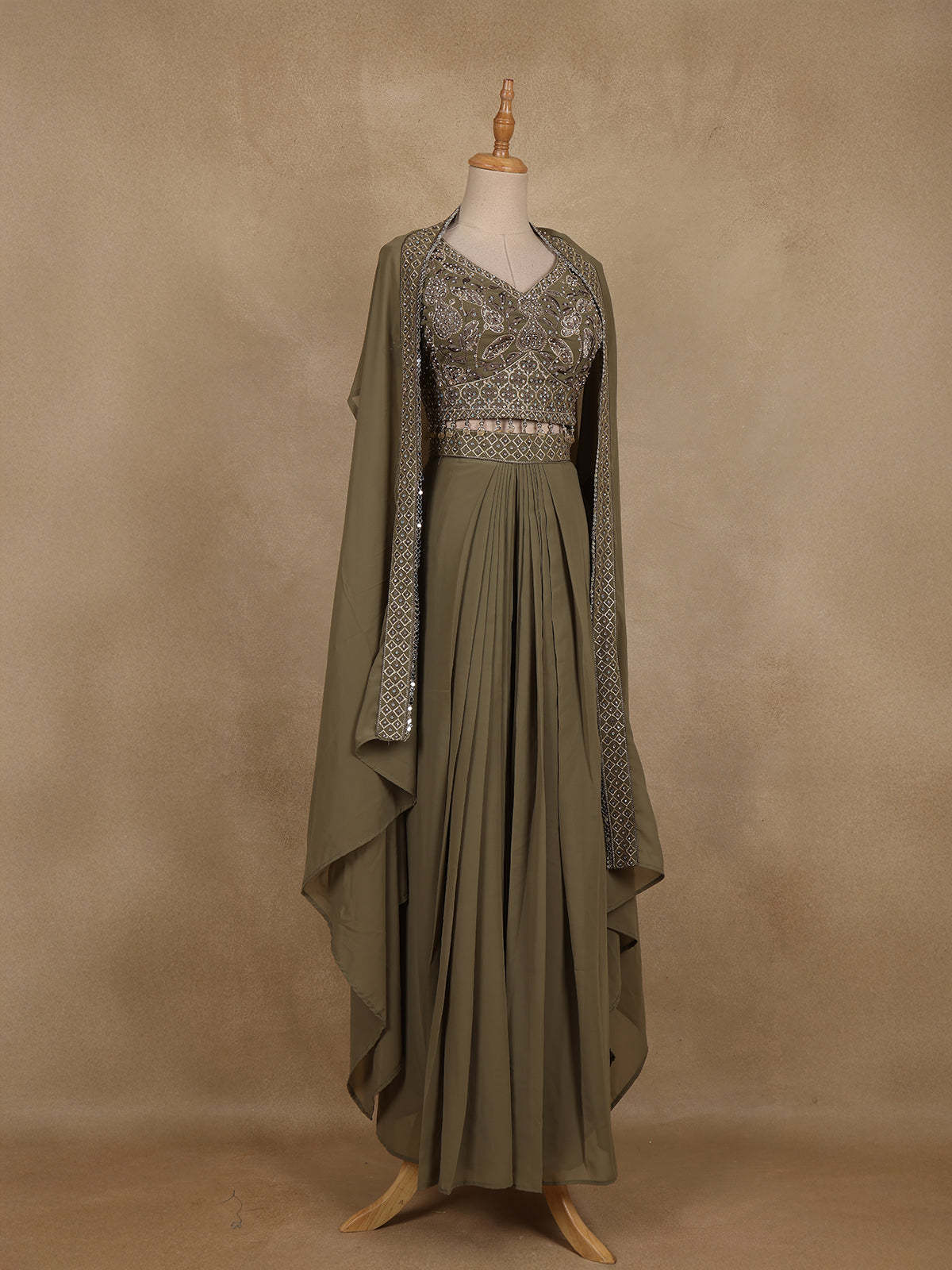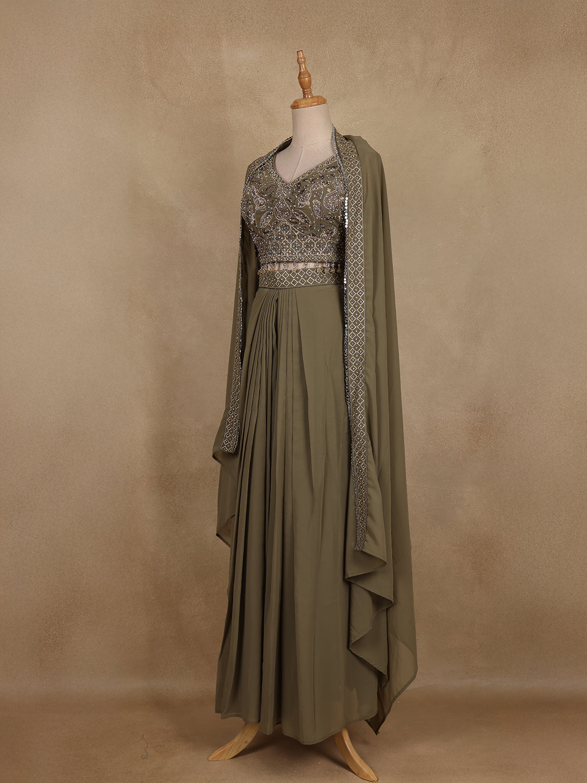 The flowing georgette skirt complements the embroidered top beautifully, offering a graceful silhouette that moves effortlessly with every step. A matching cape dupatta completes the look, adding a touch of contemporary drama and elegance. Ideal for festive gatherings, sangeet nights, or wedding celebrations, this outfit brings together tradition and trend in perfect harmony.