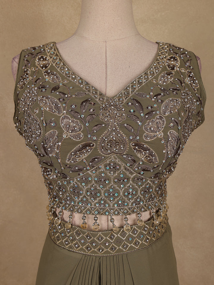 Make a radiant statement with this Sage Green Floral Embroidered Georgette Skirt Top Set, a perfect blend of festive vibrance and modern sophistication. The sleeveless top features a charming sweetheart neckline, delicately enhanced with floral embroidery that adds a refined, feminine touch.