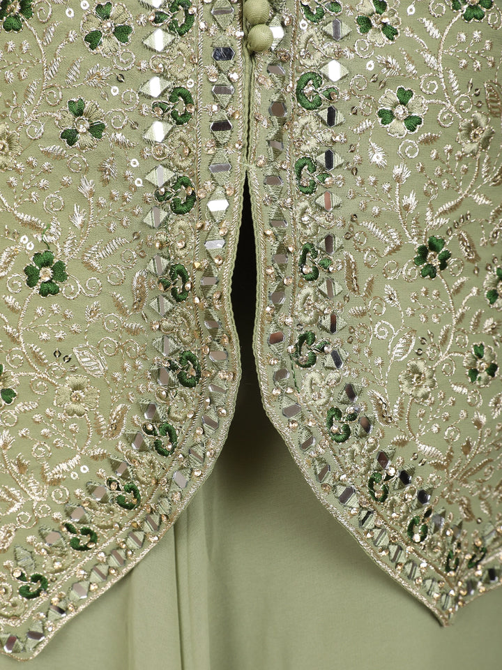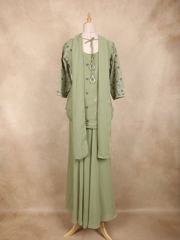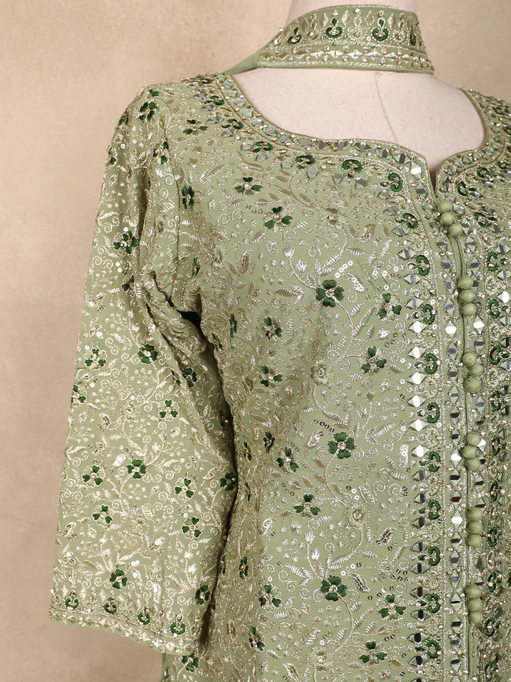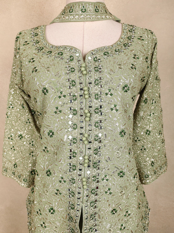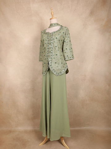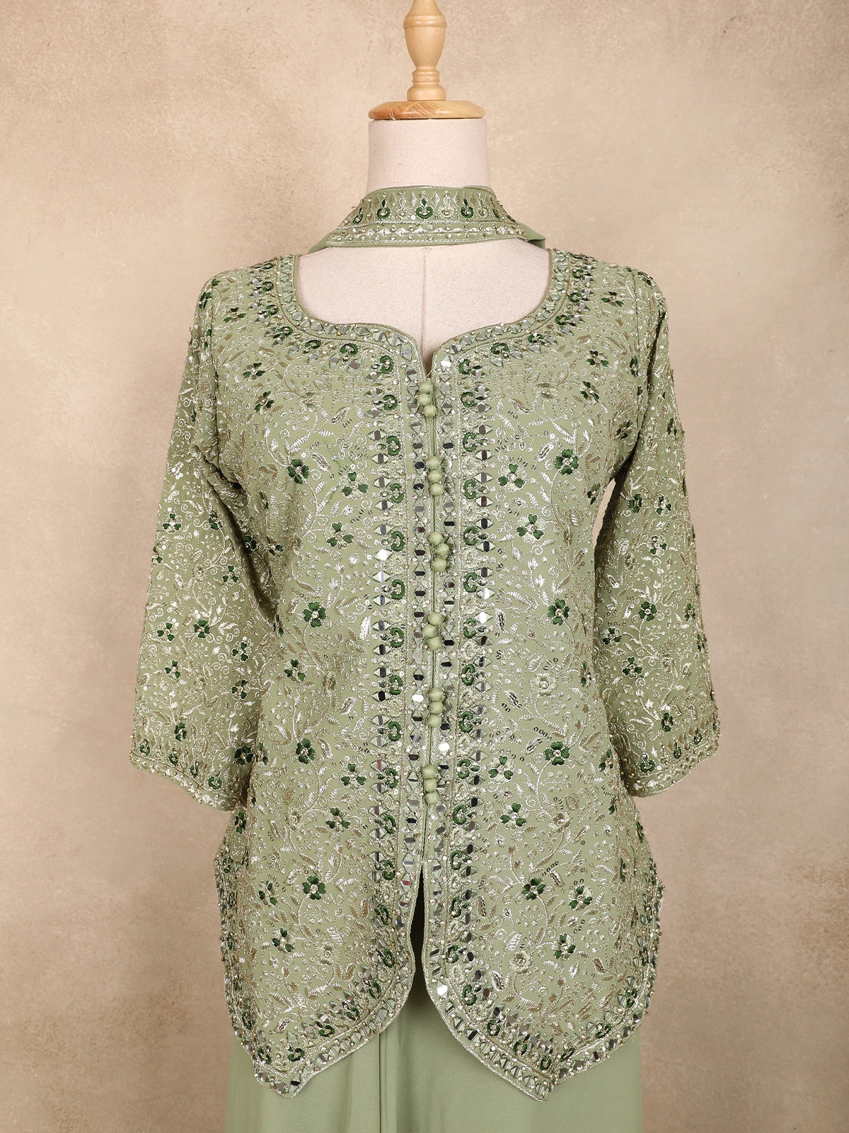 Sage Green Floral Embroidered Georgette Peplum Palazzo Suit with Choker Dupatta