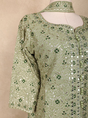 Radiate subtle luxury in this Sage Green Georgette Peplum Palazzo Suit, exquisitely detailed with mirror, zari, and sequin embroidery all over the peplum top. The intricate floral patterns shimmer with silver highlights, beautifully complementing the soft pastel hue.