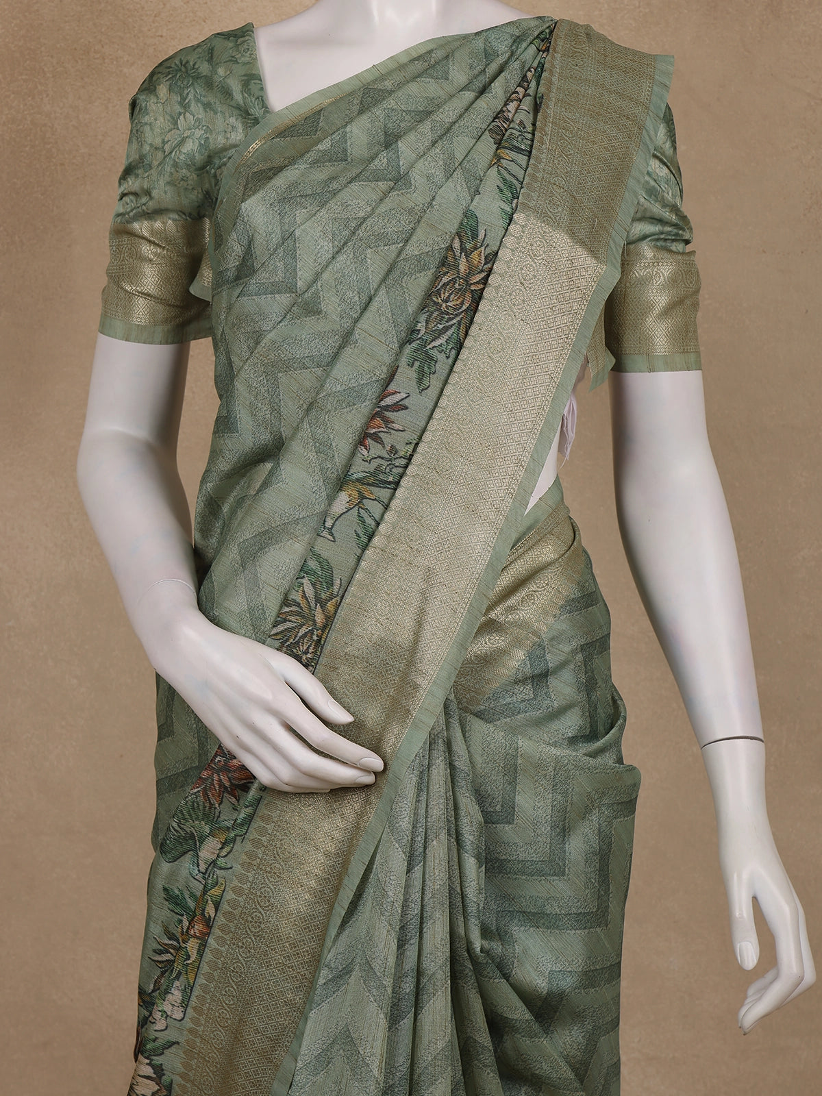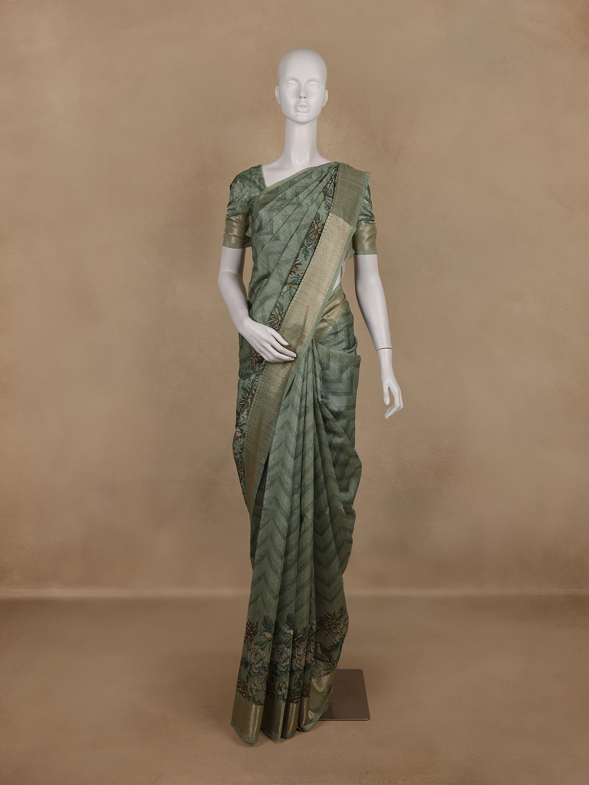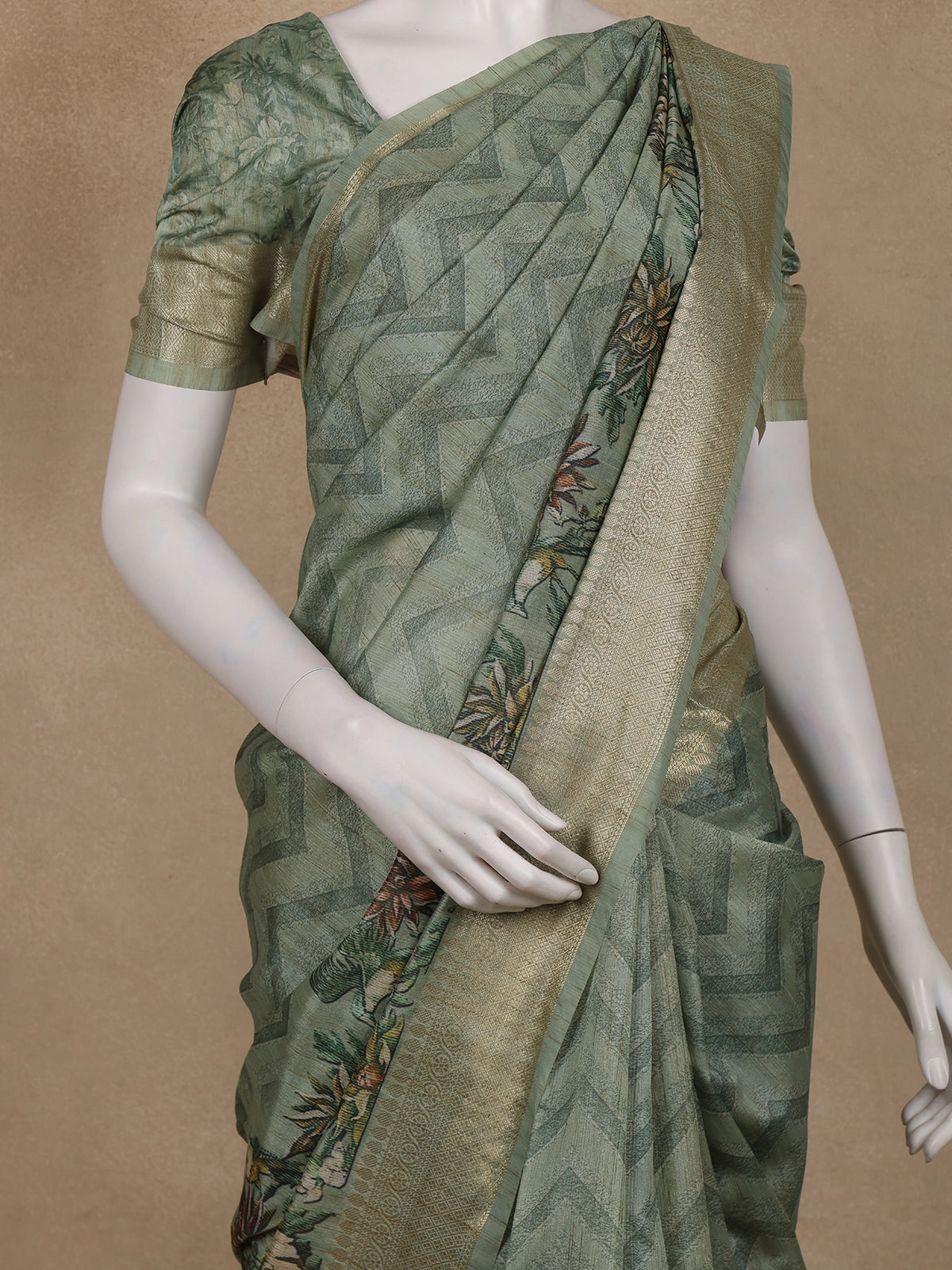 Grace your wardrobe with this Sage Green Chevron and Floral Woven Tussar Silk Saree, a sublime blend of artistry and sophistication. The saree showcases an intricate chevron pattern across the body, highlighted with delicate floral woven motifs along the border, creating a stunning contrast of structure and softness.