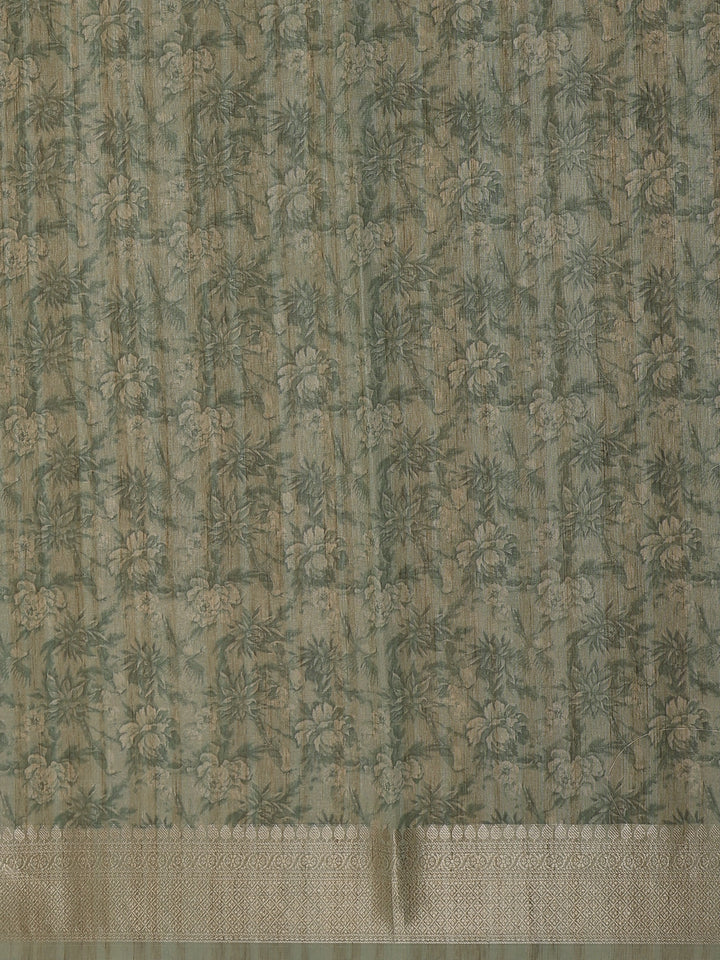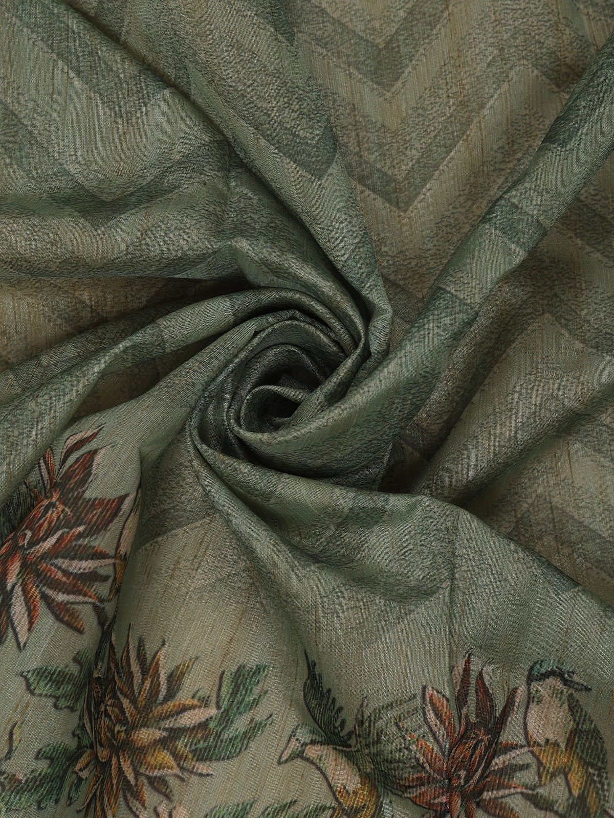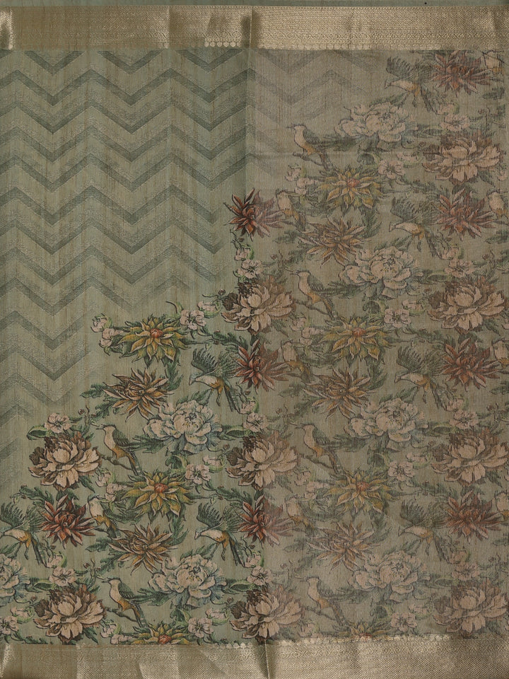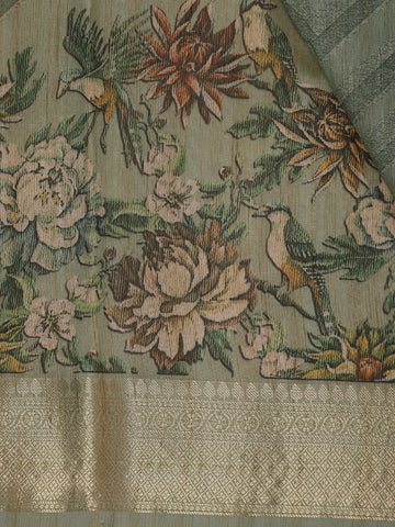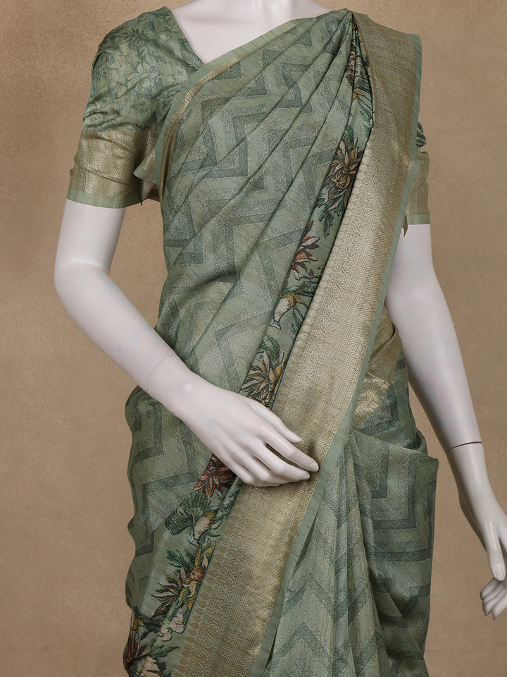 Grace your wardrobe with this Sage Green Chevron and Floral Woven Tussar Silk Saree, a sublime blend of artistry and sophistication. The saree showcases an intricate chevron pattern across the body, highlighted with delicate floral woven motifs along the border, creating a stunning contrast of structure and softness.