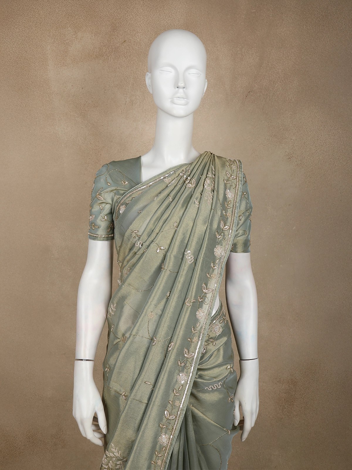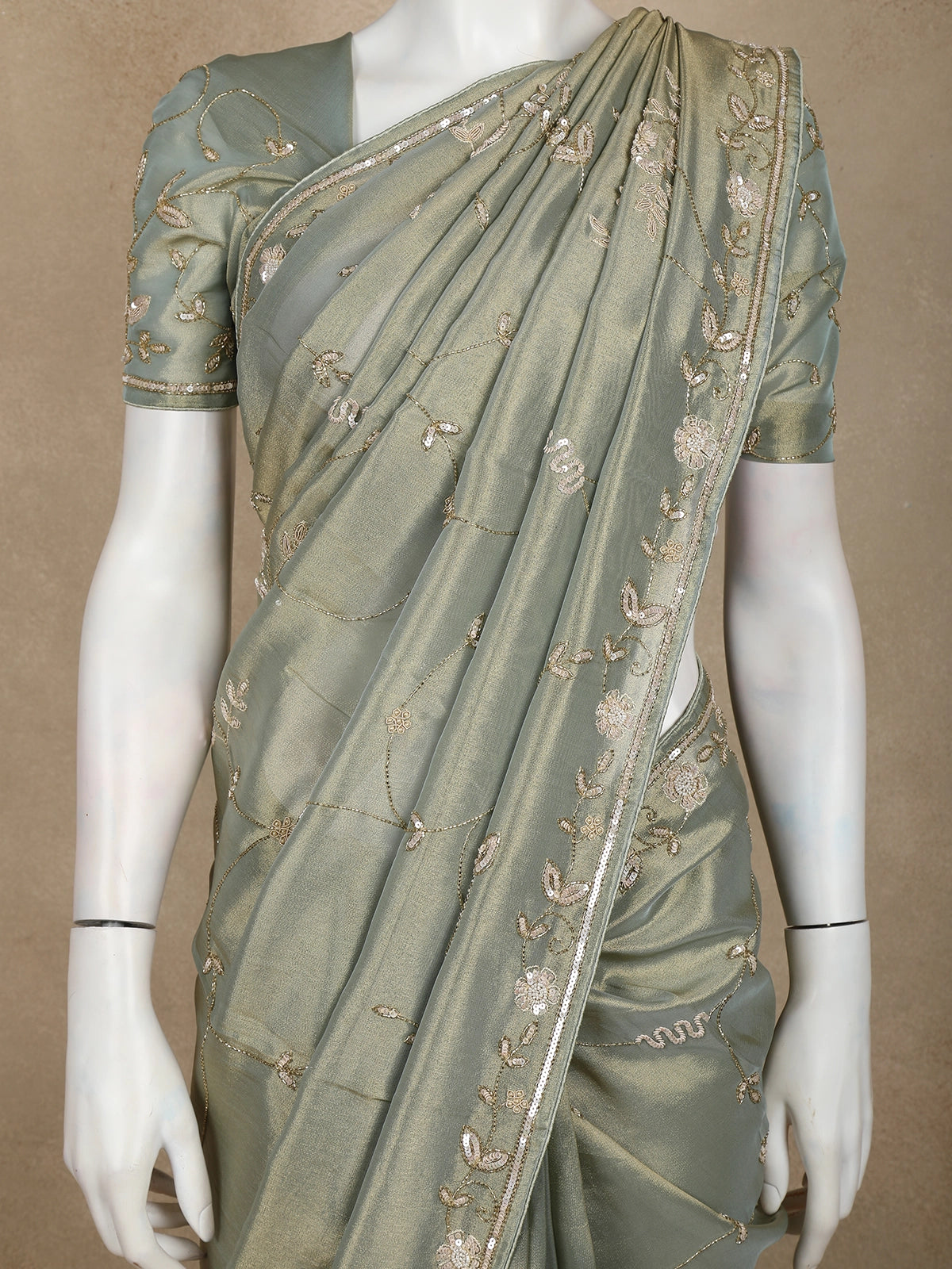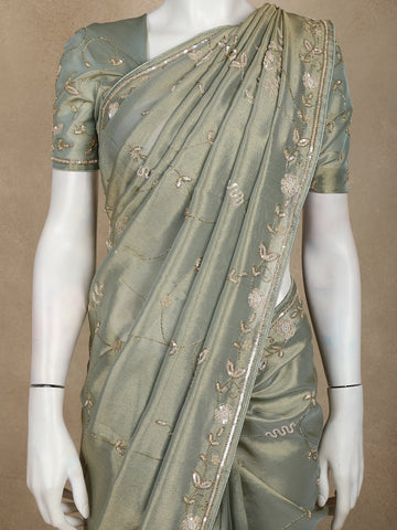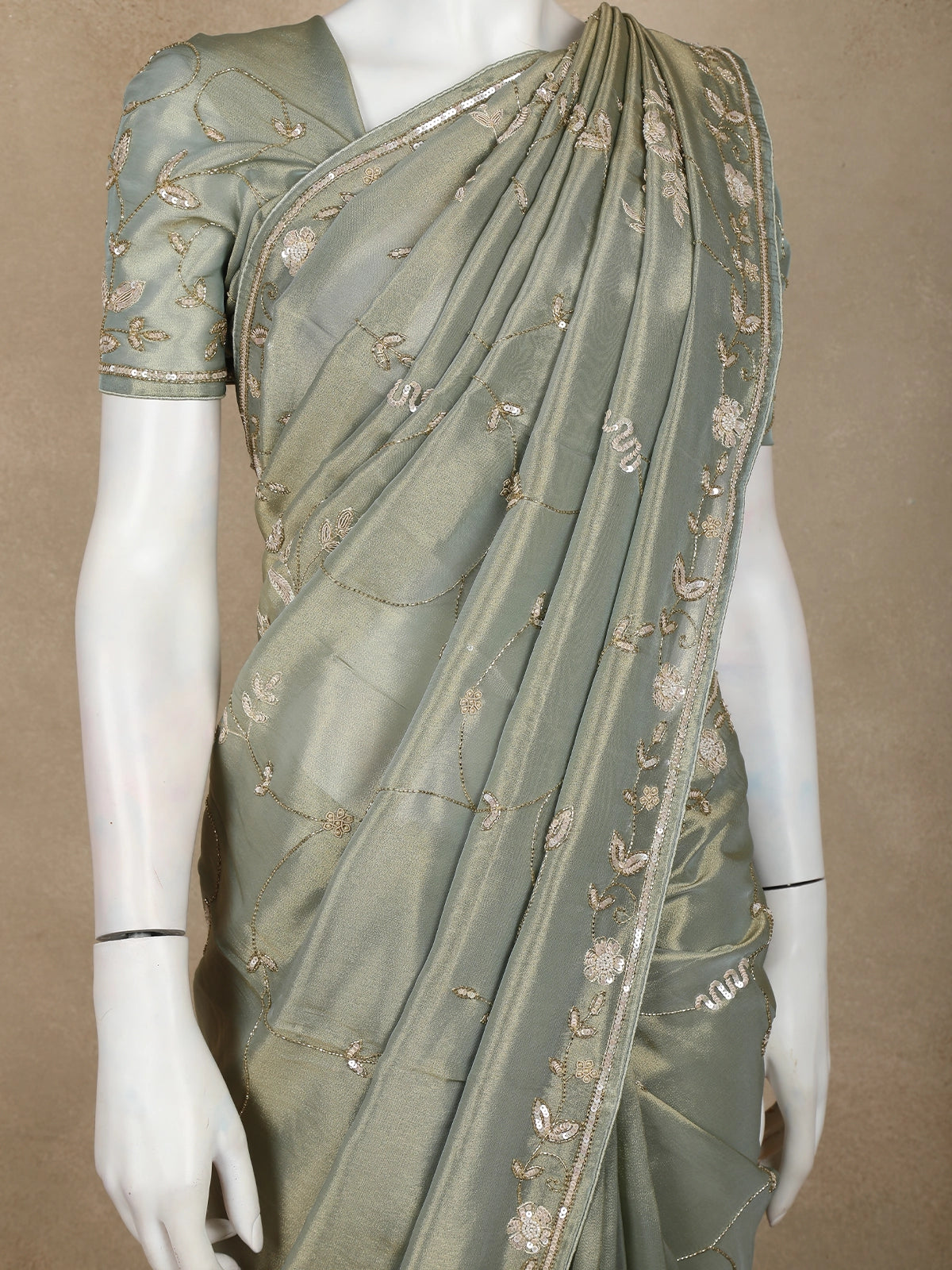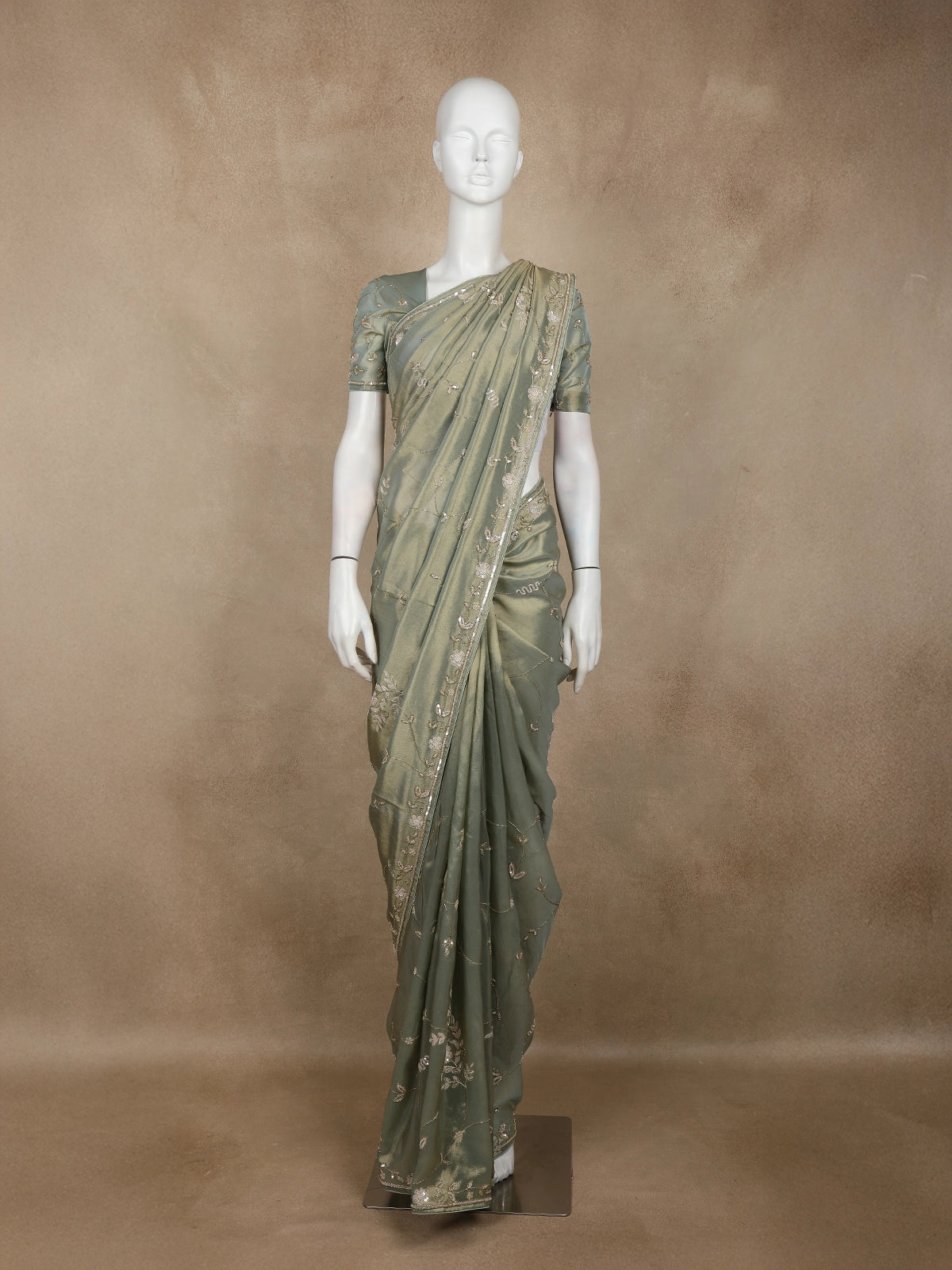 Sage Green Floral Sequins Embroidered Tissue Silk Saree with Designer Border