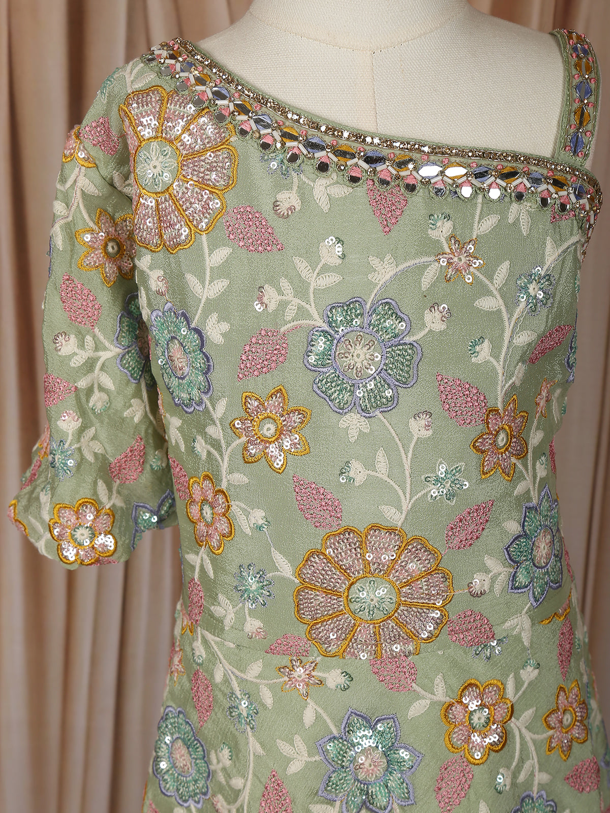 Soft, elegant, and beautifully festive — this sage green kids palazzo suit is crafted to bring effortless charm to every celebration. The top features all-over multicolor floral thread embroidery highlighted with delicate sequins, giving it a graceful and lively appeal. The one-shoulder inspired neckline with an attached draped dupatta adds a stylish and modern touch while still keeping the outfit sweet and age-appropriate.