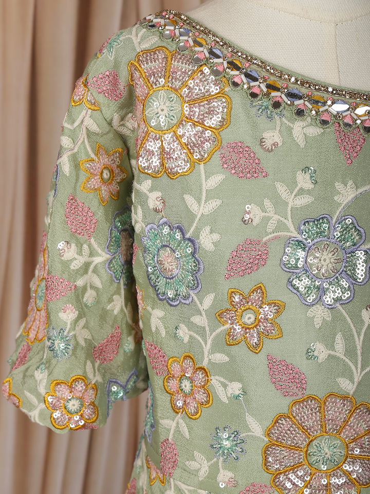 Sage Green Floral Thread Embroidered Design Georgette Kids Palazzo Suit