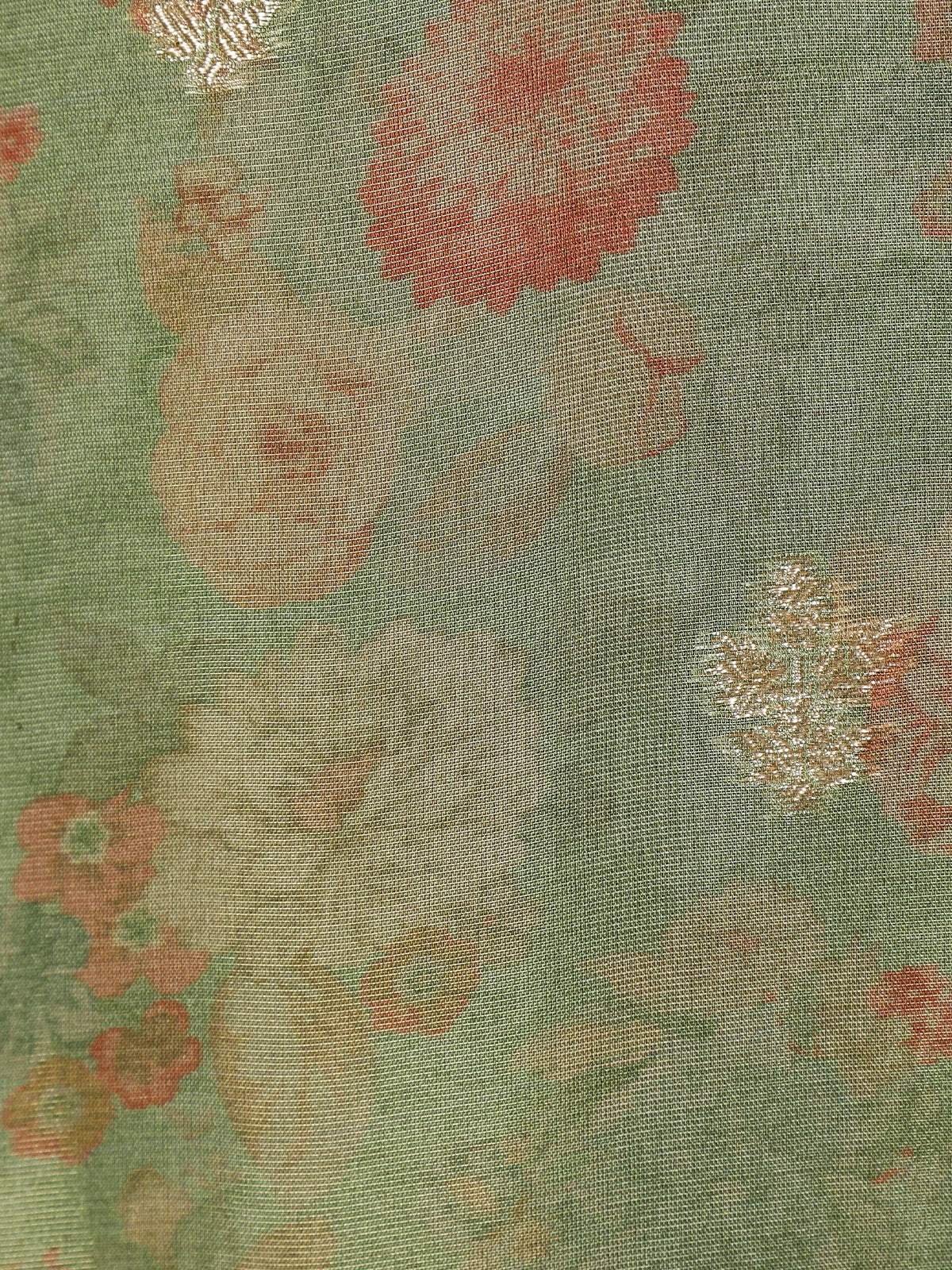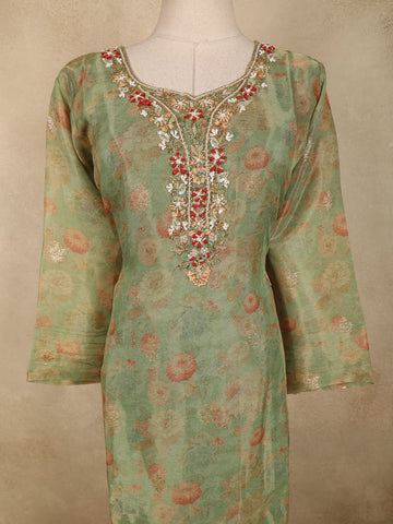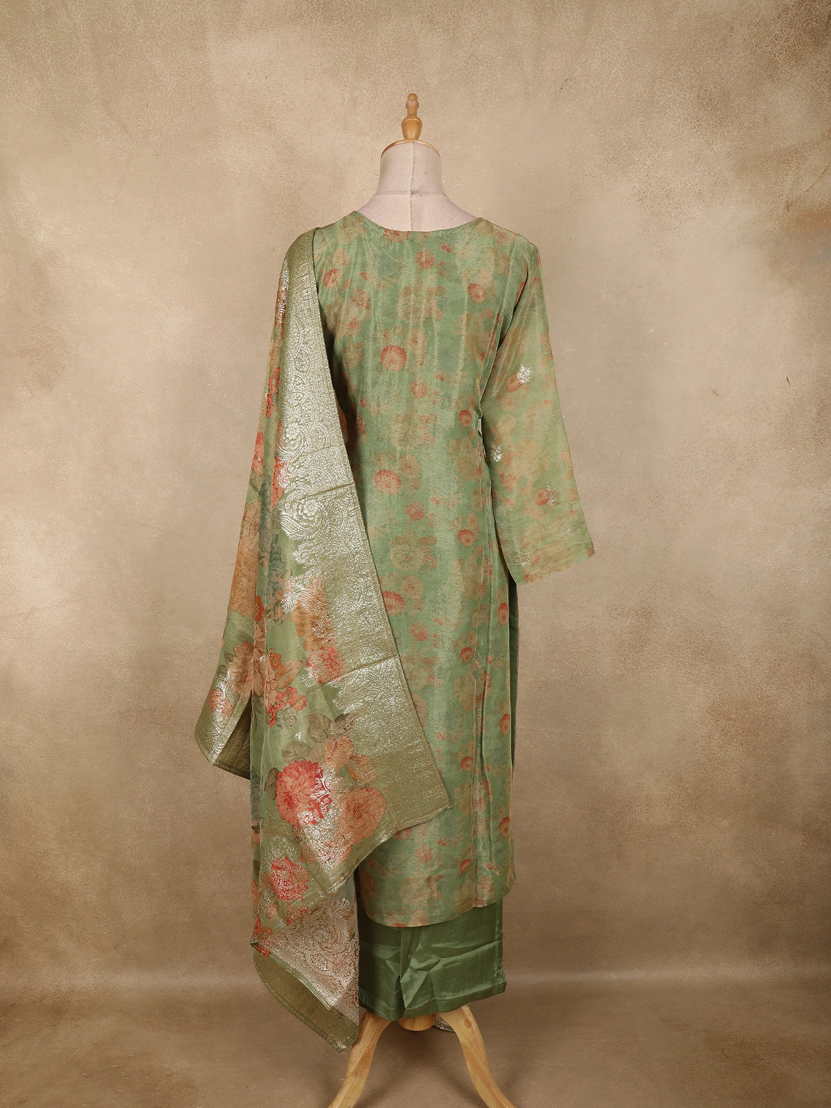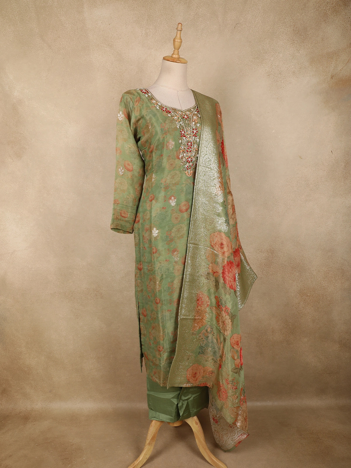 Sage Green Floral Thread Embroidered Design Tissue Silk Straight Cut Salwar Suit