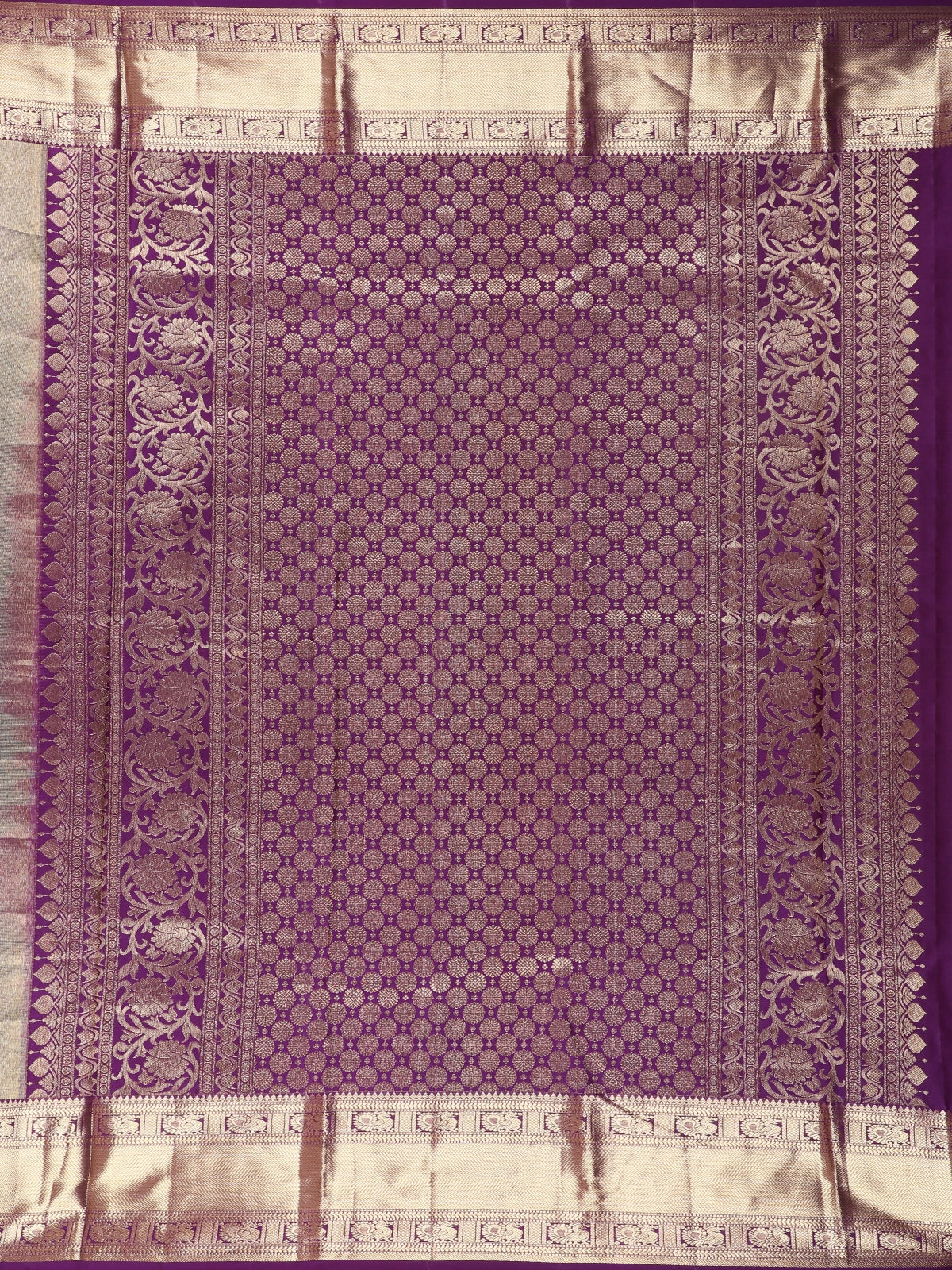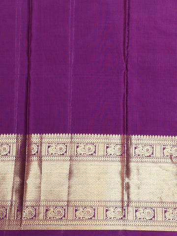 Accentuating the saree is a rich contrast purple zari border, intricately woven to add depth and royal appeal. The luxurious gold zari work along the border and pallu highlights the heritage artistry of Kanchipuram weaving, creating a striking balance between subtle elegance and festive richness.