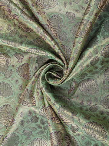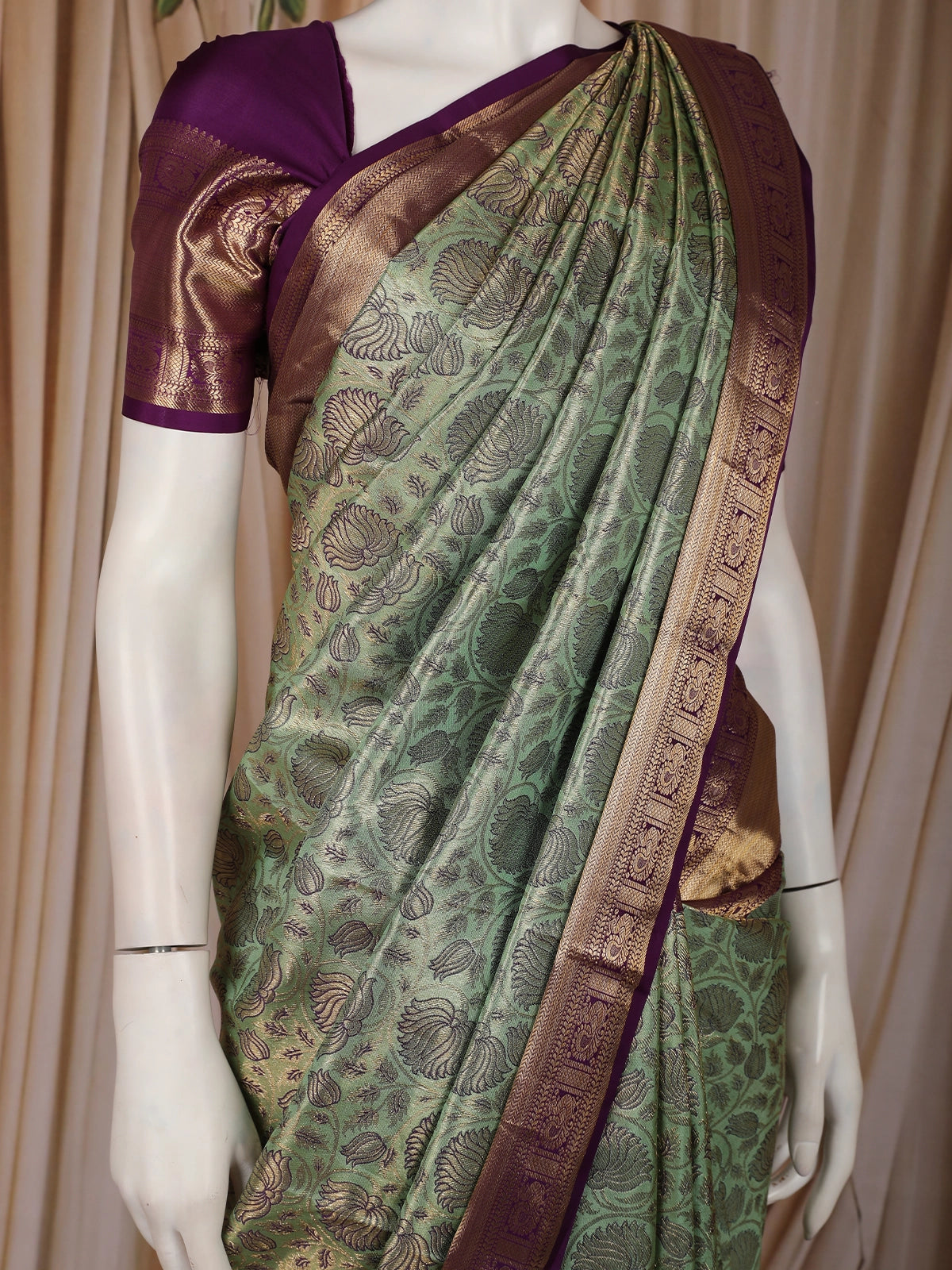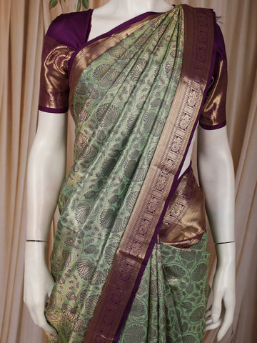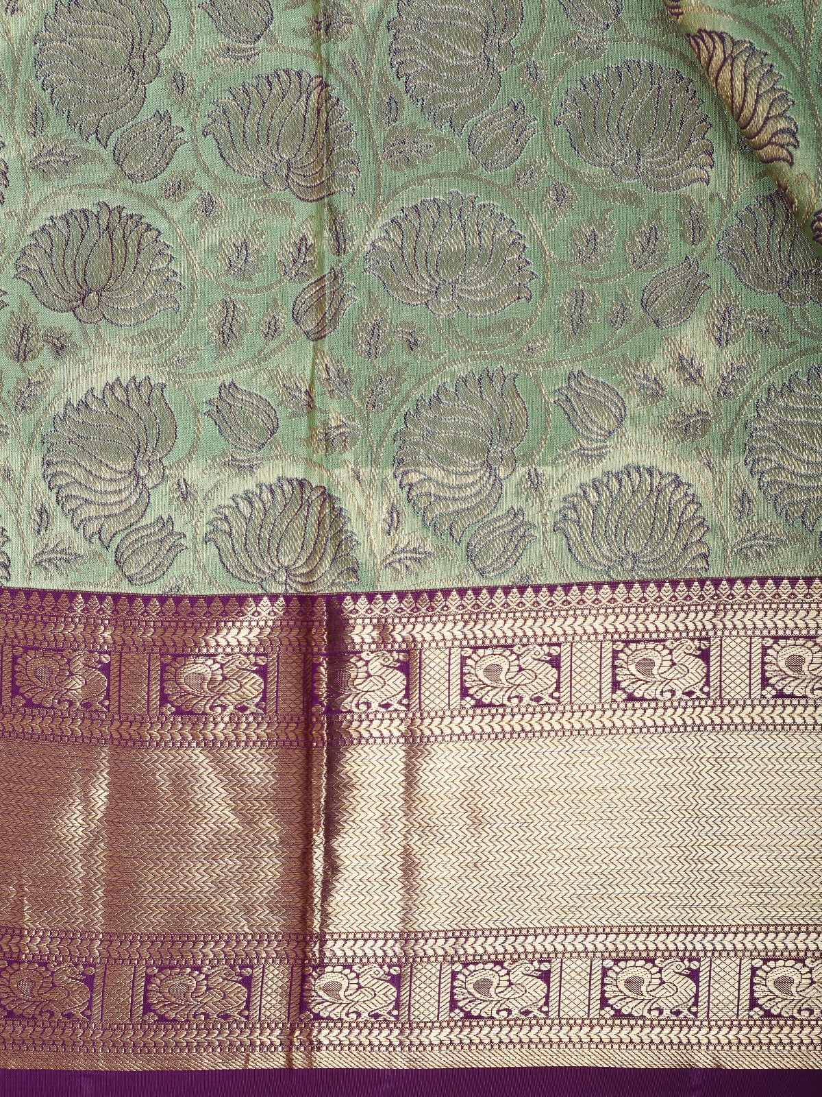 Sage Green Floral Woven Pure Kanchipuram Silk Saree with Zari Border