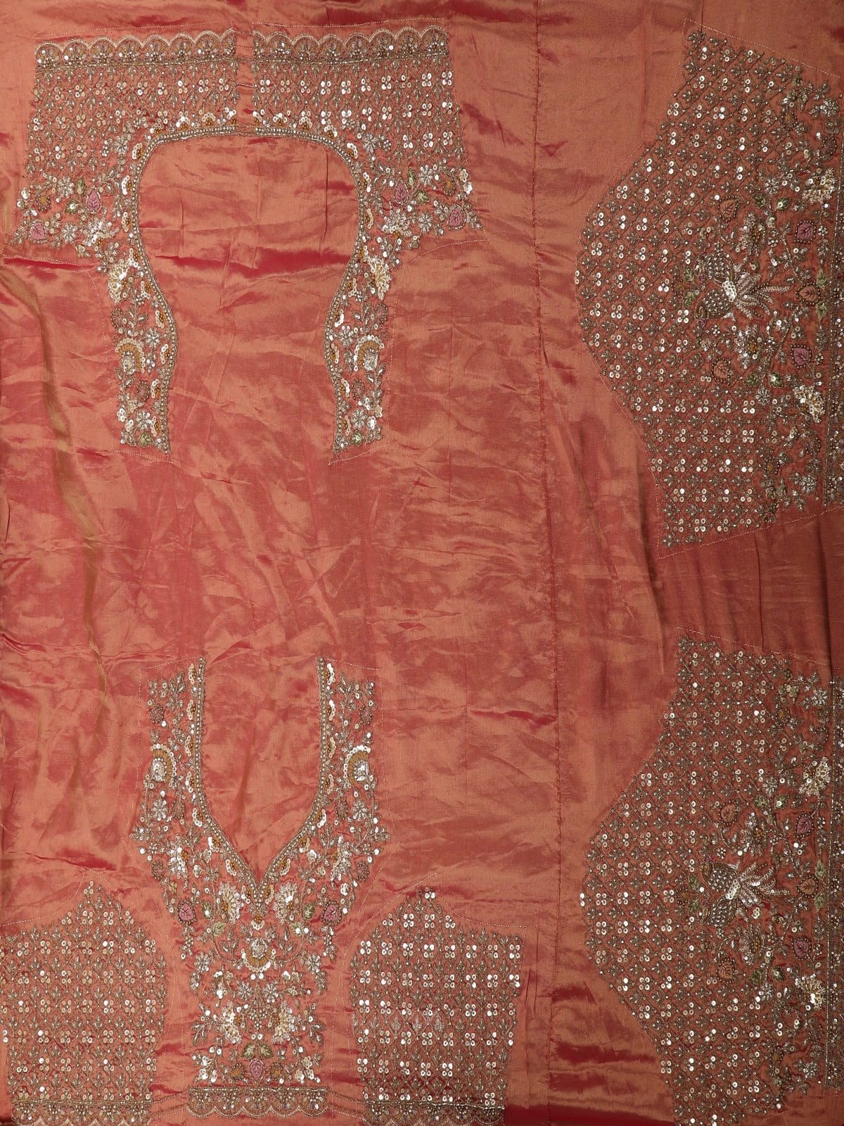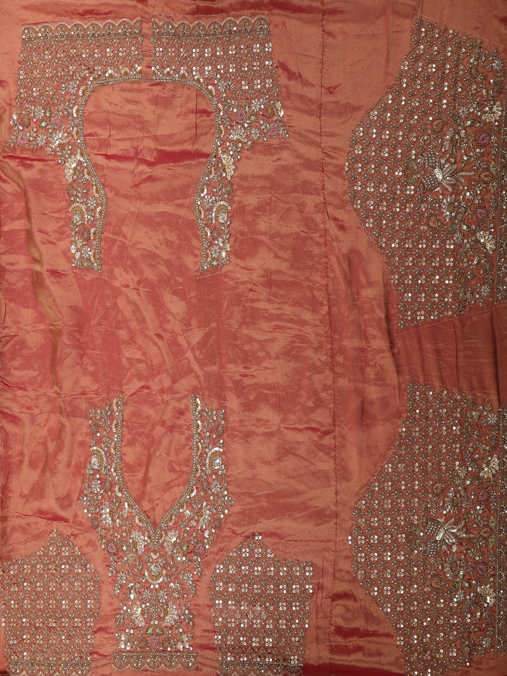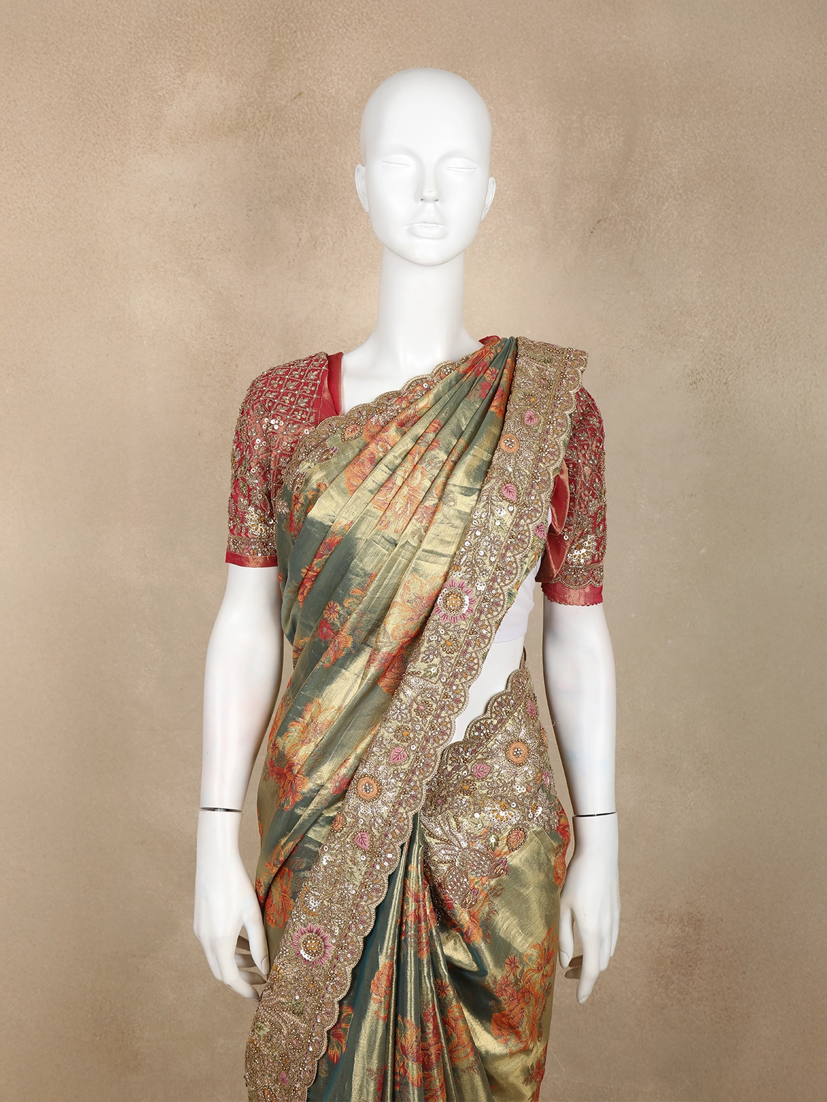 Paired with a matching silk blouse richly embellished with floral sequins and thread work, the ensemble embodies a perfect blend of traditional artistry and lavish craftsmanship—ideal for brides, bridesmaids, and grand occasions.