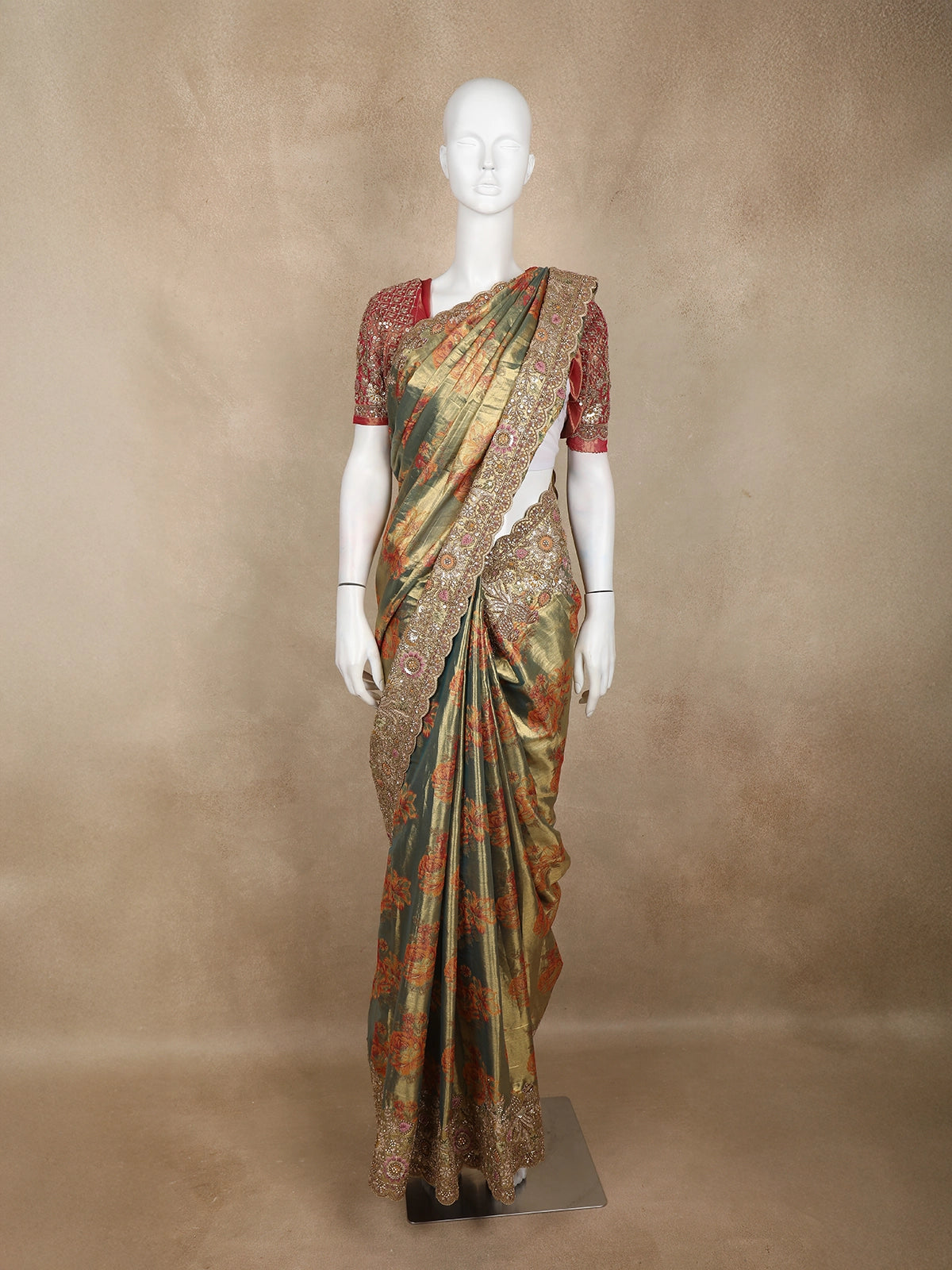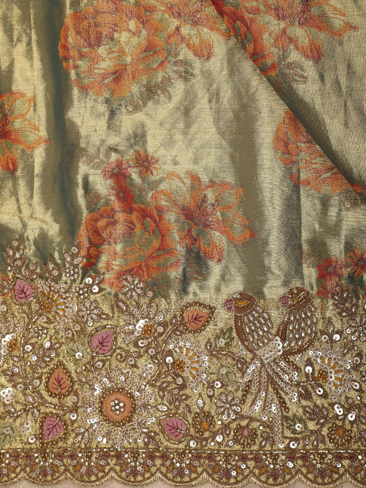 Elevate your festive elegance with this luxurious Sage Green & Gold Tissue Banarasi Saree. Showcasing timeless floral woven motifs in warm orange and gold tones, the saree radiates a regal aura. The highlight is its exquisitely detailed scalloped border—adorned with zari, sequins and thread embroidery that adds a celebration-worthy charm to every drape.