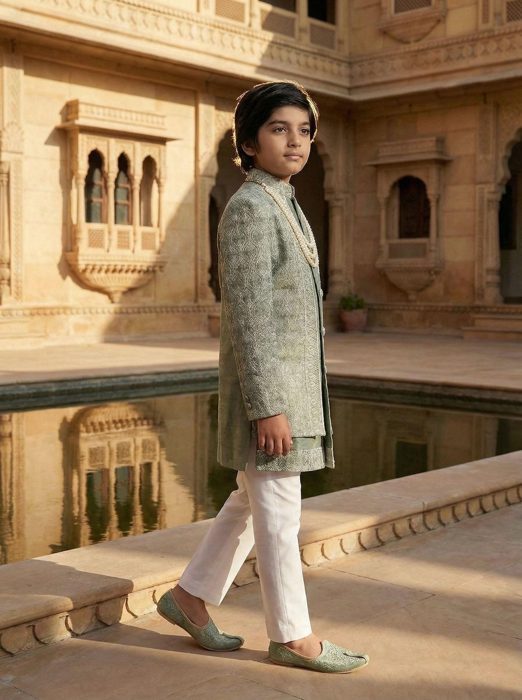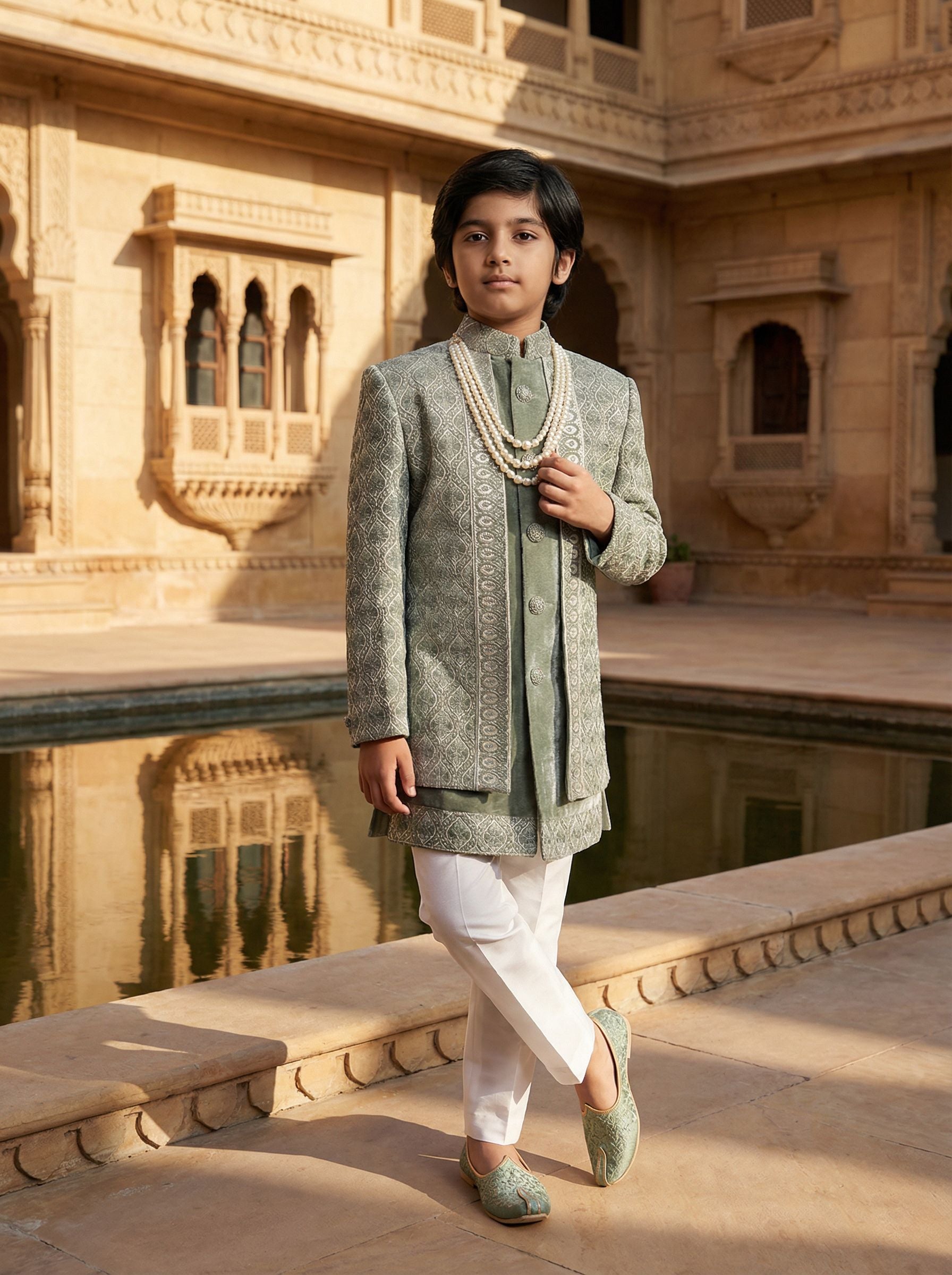 Step into timeless elegance with this exquisite sage green boys' sherwani set — a luxurious ensemble that beautifully blends royal heritage with contemporary design. Crafted from premium-quality velvet, the sherwani is adorned with intricate silver thread embroidery in classic floral and leaf motifs, lending it a refined and opulent appeal. The embroidery flows seamlessly along the front panels, collar, and sleeves, highlighted further by shimmering sequins that catch the light with every movement.
