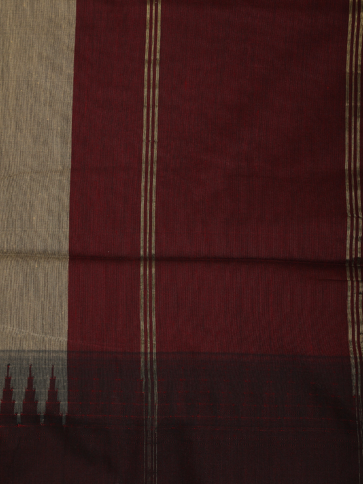 Crafted from premium Kalyani cotton, this saree offers a breathable, lightweight texture with a gentle natural sheen, ensuring all-day comfort. The saree features a solid body that beautifully highlights the richness of the fabric, while the contrast royal maroon temple border adds a striking traditional touch. Accented with a fine gold line, the temple-inspired border enhances the saree’s ethnic appeal without overwhelming its minimalist design.
