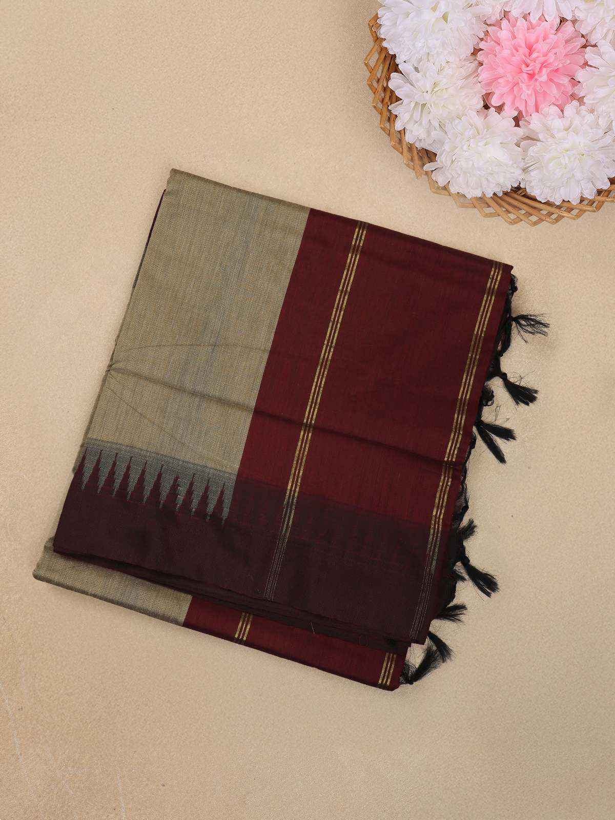 Sage Grey Solid Design Kalyani Cotton Saree with Contrast Temple Border